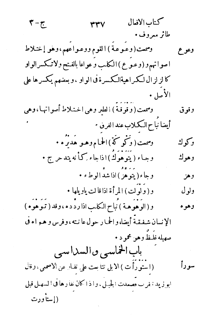 وعوع: وسمعت "وعوعة" القوم ووعواعهم وهو اختلاط أصواتهم و "وعوع" الكلب وعواعا بالفتح ولا تكسر الواو كالزلزال لكراهية الكسرة في الواو وبعضهم يكسرها على الأصل.