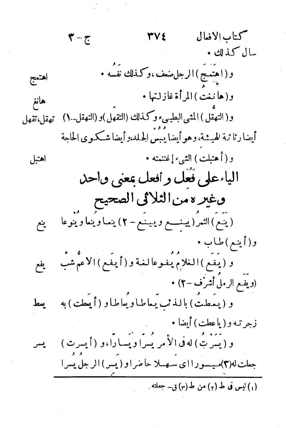 الياء على فعل وافعل بمعنى واحد وغيره من الثلاثي الصحيح