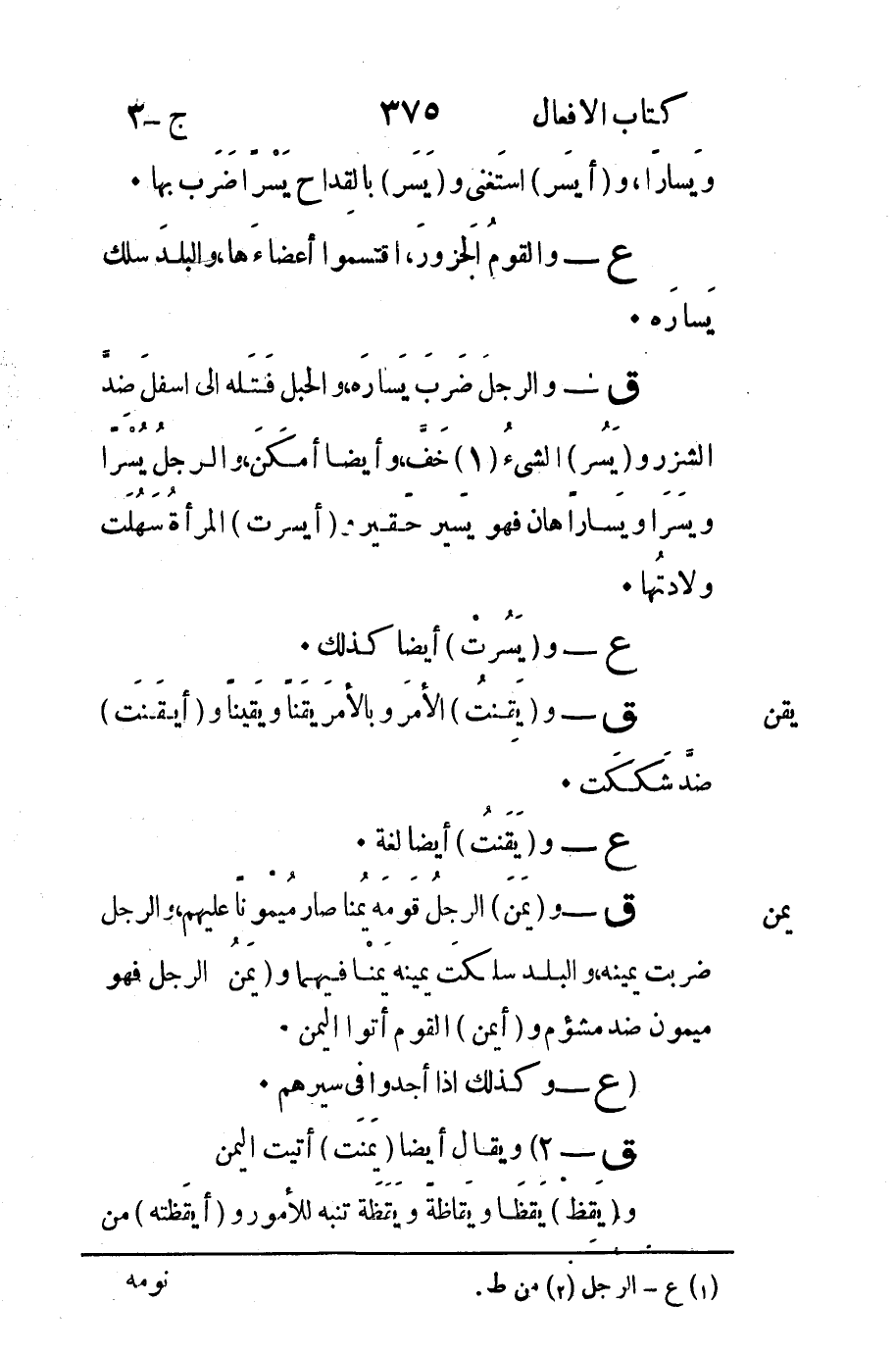 يمن: ق - و "يمن" الرجل قومه يمنا صار ميمونا عليهم والرجل ضربت يمينه والبلد سلكت يمينه يمنا فيهما و "يمن الرجل فهو ميمون ضد مشؤمو "أيمن" القوم أتوا اليمن.