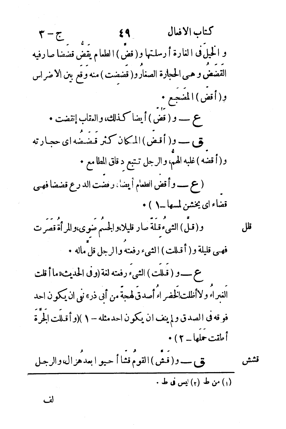 ع - و "قَلَلت" الشيءَ رفعته لغة "وفي الحديث: "ما أقلت الغَبراءُ ولا أظلت الخَضراءُ أصدقَ لهجةً من أبي ذر" نفى أن يكون أحد فوقه في الصدق ولم ينف أن يكون أحد مثله -1" "وأقلَلت الجَرَّةَ أطقت حَملَها -2".