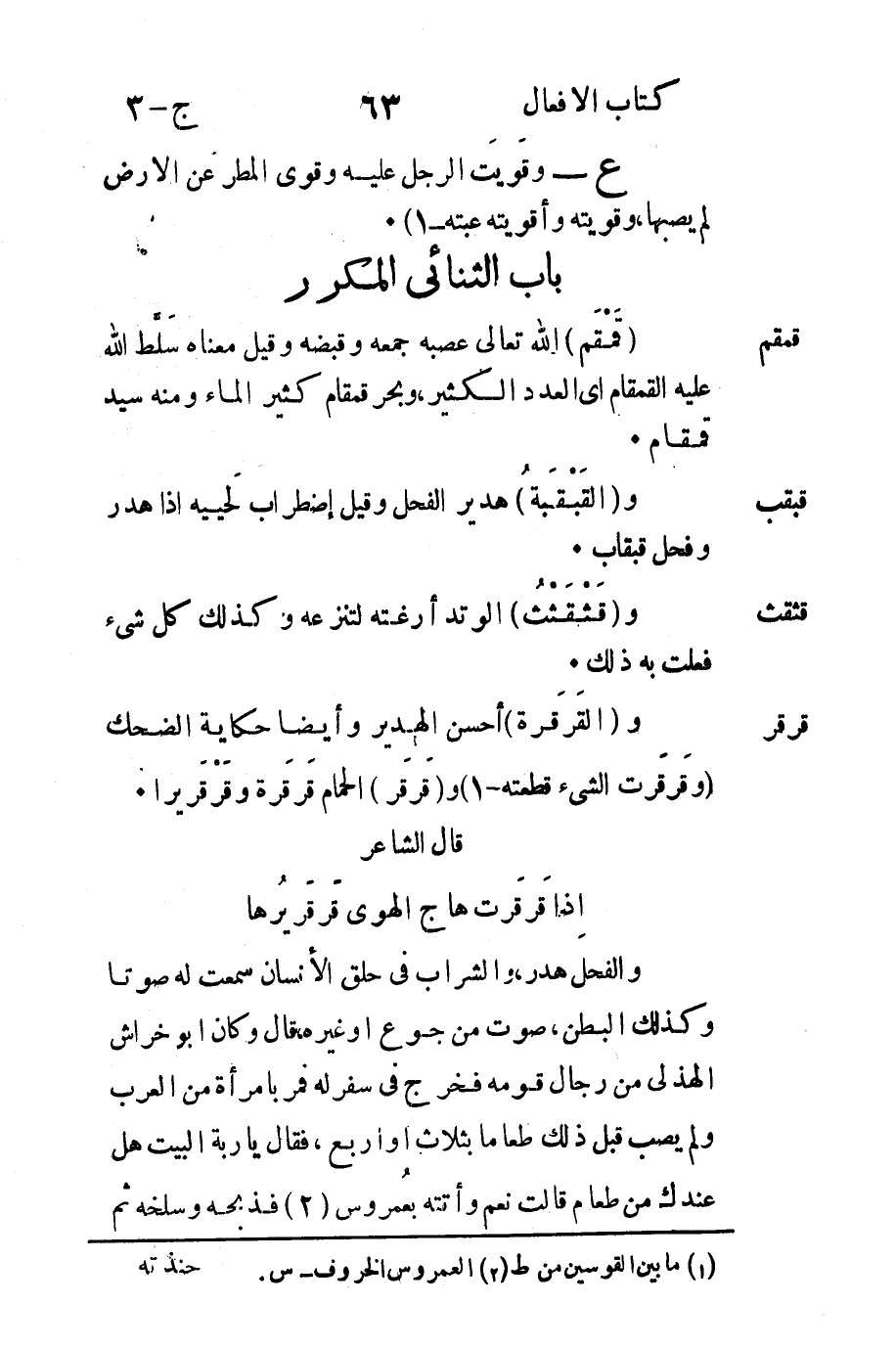 والفحلَ هدر والشراب في حلق الإنسان سمعت له صوتاً وكذلك البطن صوت من جوع أو غيره قال وكان أبو خراش الهذلي من رجال قومه فخرج في سفر له فمر بامرأة من العرب ولم يصب قبل ذلك طعاماً بثلاث أو أربع فقال يا ربة البيت هل عندك من طعام قالت نعم وأتته بُعمروس2 فذبحه وسلخه ثم
