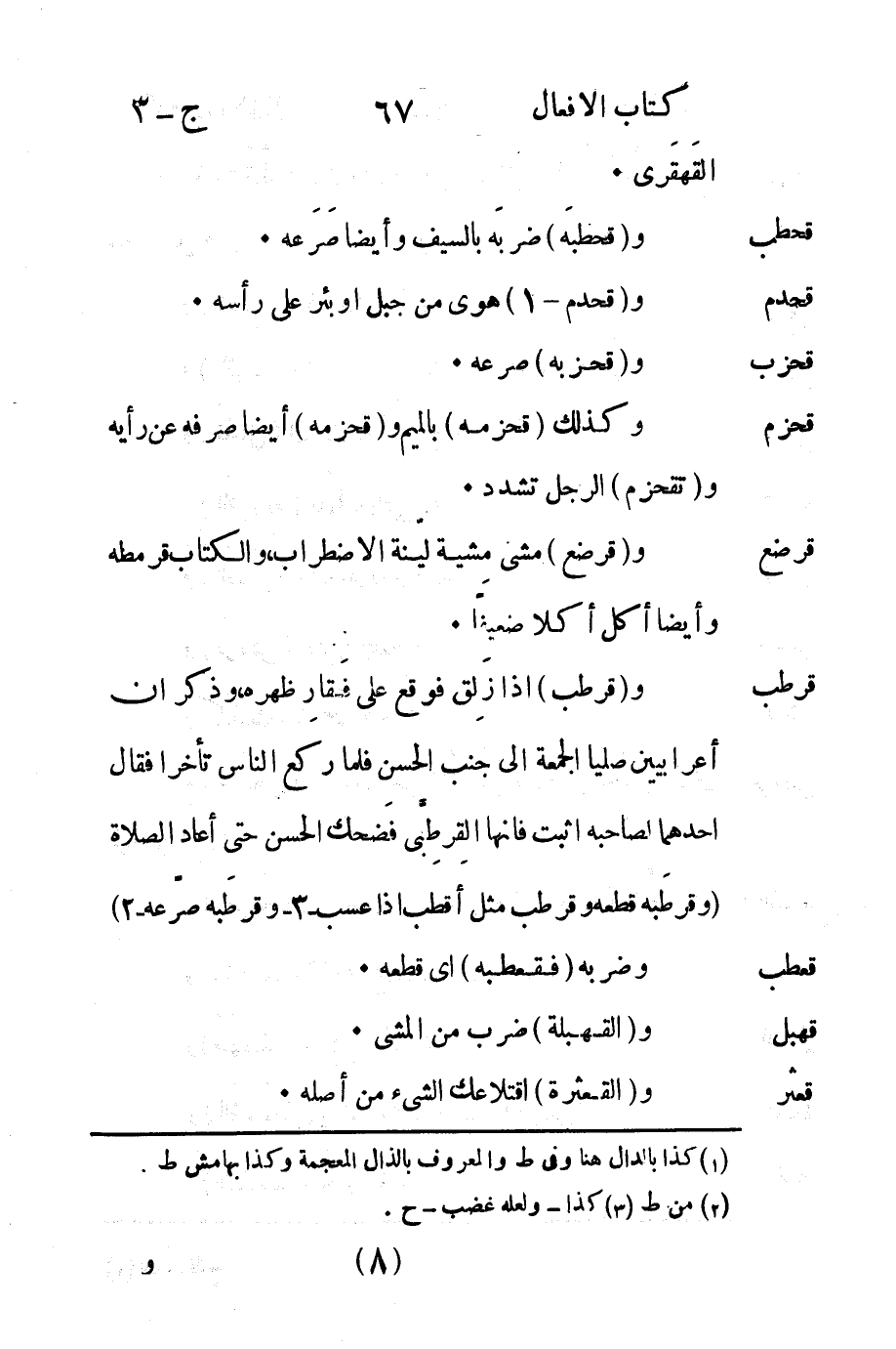 قرطب: و "قرطب" إذا زَلِق فوقع على فَقارِ ظهره وذكر أن أعرابيين صليا الجمعة إلى جنبِ الحسن فلما ركَع الناس تأخرا فقال أحدهما لصاحبه اثبت فإنها القِرطِبَّي فَضحك الحسن حتى أعاد الصلاة "وقرطَبه قطعة وقرطب مثل أقطب إذا عسب -2 وقرطَبه صرّعه -3".