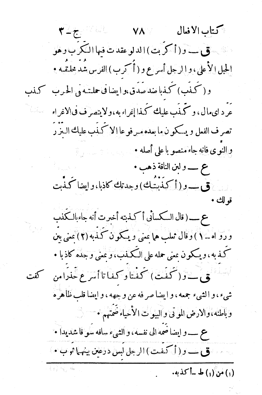 كذب: و "كَذَب" كَذِباً ضد صَدَق وأيضاً في حملته في الحرب عَرّد اي مال وكّذب عليك كَذا إغراء به ولا يتصرف في الإغراء تصرف الفعل ويكون ما بعده مرفوعاً ألا كَذبَ عليك البَزْرَ والنَّوى فإنه جاء منصوباً على أصله.
