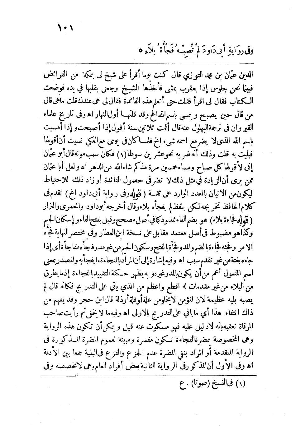 القيروان في ترجمة البهلول عنه قال أقمت ثلاثين سنة أقول إذا أصبحت وإذا أمسيت باسم الله الذي لا يضر مع اسمه شيء الخ. فلما كان في يومي مع العكي نسيت أن أقولها فبليت به قلت وذلك أنه ضربه نحو عشرين سوطًا فكان سبب موته قال أبو عثمان إني لأقولها كل صباح ومساء خمسين مرة مذ كم شاء الله من الدهر اهـ، ولعل أبا عثمان ممن يرى أن الزيادة في مثل ذلك لا تضر في حصول الفائدة أو زاد ذلك للاحتياط ليكون من الإتيان بالعدد الوارد على نفسه. قوله: (وفي روَايةِ أَبِي دَاوُدَ الخ) تقدم في كلام الحافظ تخريجه لكن بلفظ لم يفجأه بلاء وقال أخرجه أبو داود والمعمري والبزار. قوله: (فجأَةُ بلاءٍ) هو بضم الفاء ممدود كما في أصل مصحح وقيل بفتح الفاء وإسكان الجيم وكذا هو مضبوط في أصل معتمد مقابل على نسخة ابن العطار وفي مختصر النهاية فجأه الأمر وفجئه فجاءة بالضم والمد وفجأة بالفتح وسكون الجيم من غير مد وفاجأه مفاجأة أي إذا جاءه بغتة من غير تقدم سبب اهـ، وفيه إشارة إلى أن المراد بالفجاءة ما يفجأ به والمصدر بمعنى اسم المفعول أعم من أن يكون بالمد وغيره وبه يظهر حكمة التقجيد بالفجاءة إذ ما يطرق من البلاء من غير مقدمات له اقطع واعظم من الذي يأتي على التدريج فكأنه قال لم يصبه بلية عظيمة لأن المؤمن لا يخلو من علة أو قلة أو ذلة قال ابن حجر وقد يفهم من ذاك انتفاء هذا أي ما يأتي على التدريج بالأولى اهـ، وفيه ما لا يخفى ثم رأيت صاحب المرقاة تعقبه بأنه لا دليل عليه فهو مسكوت عنه قيل ويمكن أن تكون هذه الرواية وهي المخصوصة بمضرة الفجاءة تكون مفسرة ومبينة لعموم المضرة المذكورة في الرواية المتقدمة أو المراد بنفي المضرة عدم الجزع والفزع في البلية جمعًا بين الأدلة اهـ، وفي الأول أن المذكور في الرواية الثانية بعض أفراد الغام وهي لا تخصصه وفي