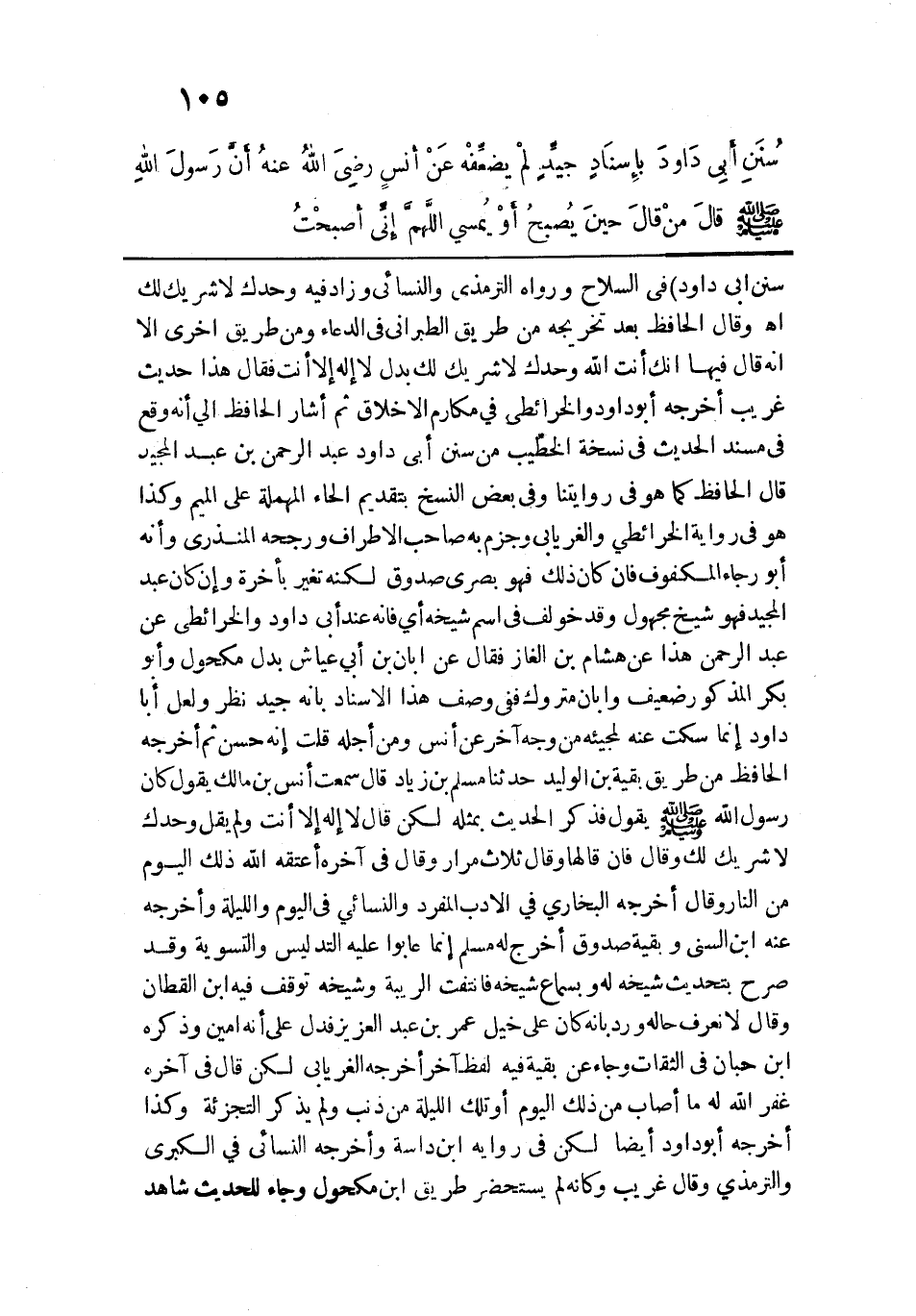 سُنَنِ أَبِي دَاوُدَ) في السلاح ورواه الترمذي والنسائي وزاد فيه وحدك لا شريك لك اهـ، وقال الحافظ بعد تخريجه من طريق الطبراني في الدعاء ومن طريق أخرى إلّا أنه قال فيها إنك أنت الله وحدك لا شريك لك بدل لا إله إلَّا أنت فقال هذا حديث غريب أخرجه أبو داود والخرائطي في مكارم الأخلاق ثم أشار الحافظ إلى أنه وقع في مسند الحديث في نسخة الخطيب من سنن أبي داود وعبد الرحمن بن عبد المجيد قال الحافظ كما هو في روايتنا وفي بعض النسخ بتقديم الحاء المهملة على الميم وكذا هو في رواية الخرائطي والغريابي وجزم به صاحب الأطراف ورجحه المنذري وأنه أبو رجاء المكفوف فإن كان ذلك فهو بصري صدوق لكنه تغير بأخرة وإن كان عبد المجيد فهو شيخ مجهول وقد خولف في اسم شيخه أي فإنه عند أبي داود والخرائطي عن عبد الرحمن هذا عن هشام بن الغاز فقال عن أبان بن أبي داود والخرائطي عن عبد الرحمن هذا عن هشام بن الغاز فقال عن أبان بن أبي عياش بدل مكحول وأبو بكر المذكور ضعيف وأبان متروك ففي وصف هذا الإسناد بأنه جيد نظر ولعل أبا داود إنما سكت عنه لمجيئه من وجه آخر عن أنس ومن أجله قلت إنه حسن ثم أخرجه الحافظ من طريق بقية بن الوليد حدثنا مسلم بن زياد قال سمعت أنس بن مالك