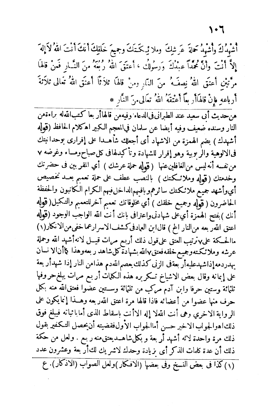 أُشْهِدُكَ وأُشْهِدُ حَمَلَةَ عَرْشِكَ وَمَلائِكَتَكَ وَجَمِيعَ خَلْقِكَ أنَّكَ أنْتَ الله الذي لا إلهَ إلا أنْتَ، وأن مُحَمدًا عَبْدُكَ وَرَسُولُكَ، أعْتَقَ اللهُ رُبُعَهُ مِنَ النارِ، فَمَنْ قَالهَا مرَّتَين أعْتَقَ الله نِصْفَهُ مِنَ النارِ، وَمَنْ قالهَا ثَلاثًا أعْتَقَ الله ثَلاثةَ أرْبَاعِهِ، فإن قالهَا أرْبَعًا أعْتَقَه الله تعَالى مِنَ النارِ".