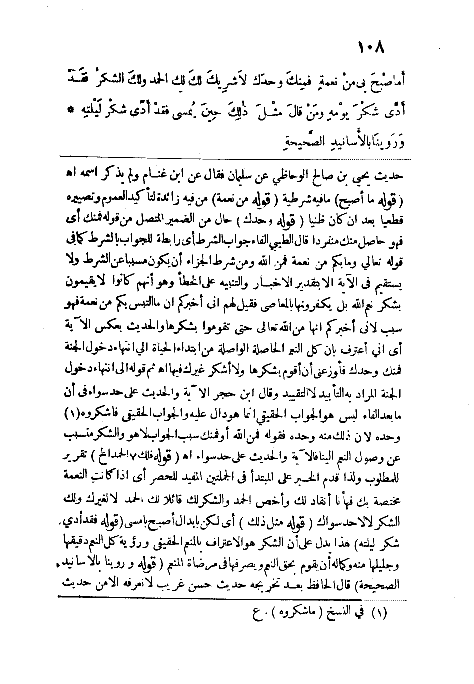 حديث يحيى بن صالح الوحاظي عن سليمان فقال عن ابن غنام ولم يذكر اسمه اهـ. قوله (ما أَصبحَ) ما فيه شرطية. قوله: (منْ نعمةٍ) من فيه زائدة لتأكيد العموم وتصييره قطعيًّا بعد أن كان ظنيًّا. قوله: (وحدَك) حال من الضمير المتصل من قوله فمنك أي فهو حاصل منك منفردا قال الطيبي الفاء جواب الشرط أي رابطة للجواب بالشرط كما في قوله تعالى: {وَمَا بِكُمْ مِنْ نِعْمَةٍ فَمِنَ اللَّهِ} [النحل: 53] ومن شرط الجزاء أن يكون مسببًا عن الشرط ولا يستقيم في الآية إلا بتقدير الإخبار والتنبيه على الخطأ وهو أنهم كانوا لا يقيمون بشكر نعم الله بل يكفرونها بالمعاصي فقيل لهم إني أخبركم أن ما التبس بكم من نعمة فهو سبب لأني أخبركم أنها من الله تعالى حتى تقوموا بشكرها والحديث بعكس الآية أي إني أعترف بأن كل النعم الحاصلة الواصلة من ابتداء الحياة إلى انتهاء دخول الجنة فمنك وحدك فأوزعني أن أقوم بشكرها ولا أشكر غيرك فيها اهـ. ثم قوله إلى انتهاء دخول الجنة المراد به التأبيد لا التقييد وقال ابن حجر الآية والحديث على حد سواء في أن ما بعد الفاء ليس هو الجواب الحقيقي إنما هو دال عليه والجواب الحقيقي فاشكروه وحده لأن ذلك منه وحده فقوله فمن الله أو فمنك سبب الجواب لا هو والشكر متسبب عن وصول النعم الينا فالآية