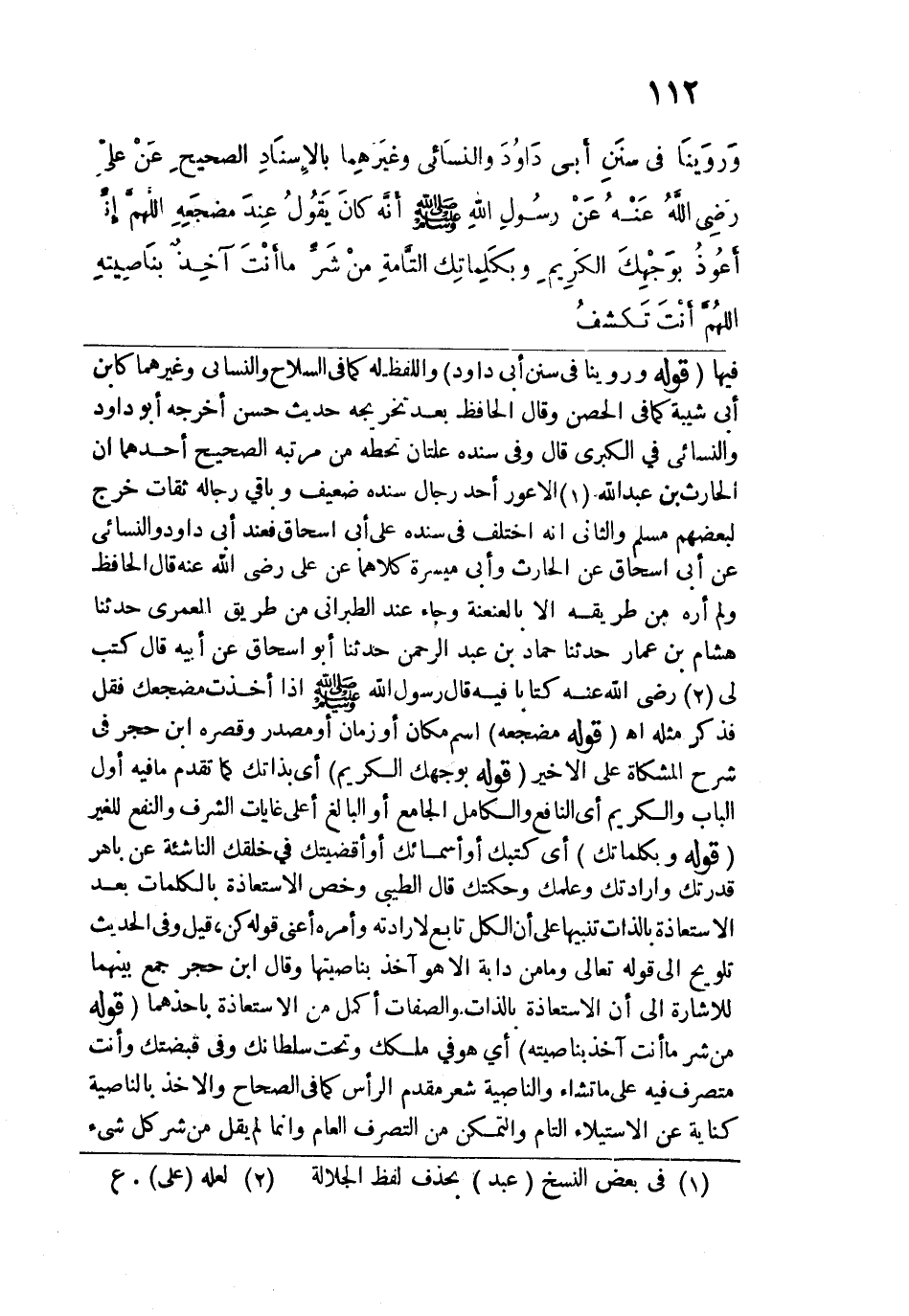 قوله: (وَرَوَينَا في سنَنِ أَبِي دَاوُدَ) واللفظ له كما في السلاح والنسائي وغيرهما كابن أبي شيبة كما في الحصين وقال الحافظ بعد تخريجه حديث حسن أخرجه أبو داود والنسائي في الكبرى قال وفي سنده علتان تحطه من مرتبة الصحيح أحدهما أن الحارث بن عبد الله الأعور أحد رجال سنده ضعيف وباقي رجاله ثقات خرج لبعضهم مسلم والثاني أنه اختلف في سنده على أبي إسحاق فعند أبي داود والنسائي عن أبي إسحاق عن الحارث وأبي ميسرة كلاهما عن علي رضي الله عنه قال الحافظ ولم أره من طريقه إلَّا بالعنعنة وجاء عند الطبراني من طريق المعمري حدثنا هشام بن عمار حدثنا حماد بن عبد الرحمن حدثنا أبو إسحاق عن أبيه قال كتب لي رضي الله عنه كتابًا فيه قال رسول الله - صلى الله عليه وسلم - إذا أخذت مضجعك فقل فذكر مثله اهـ قوله: (مضجَعِهِ) اسم مكان أو زمان أو مصدر وقصره ابن حجر في شرح المشكاة على الأخير. قولهْ (بوَجْهِكَ الكَرِيم) أي بذاتك كما تقدم ما فيه أول الباب والكريم أي النافع والكامل الجامع أو البالغ أعلى غايات الشرف والنفع للغير. قوله: (وبكَلِماتِكَ) أي كتبك أو أسمائك أو أقضيتك في خلقك الناشئة عن باهر قدرتك وإرادتك وعلمك وحكمتك قال الطيبي وخص الاستعاذة بالكلمات بعد الاستعاذة بالذات تنبيهًا على أن الكل تابع لإرادته وأمره أعني قوله كن، قيل وفي الحديث تلويح إلى قوله تعالى: {مَا مِنْ دَابَّةٍ إلا هُوَ آخِذٌ بِنَاصِيَتِهَا} [هود: 56] وقال ابن حجر جمع بينهما للإشارة إلى أن الاستعاذة بالذات والصفات أكمل من الاستعاذة بأحدهما. قوله: (منْ شَرِّ مَا أَنْتَ آخِذٌ بنَاصِيتهِ) أي هو في ملكك وتحت سلطانك وفي قبضتك وأنت متصرف فيه على ما تشاء والناصية شعر مقدم الرأس كما في الصحاح والأخذ بالناصية كناية عن الاستيلاء التام والتمكن من التصرف العام وإنما لم يقل من شر كل شيء