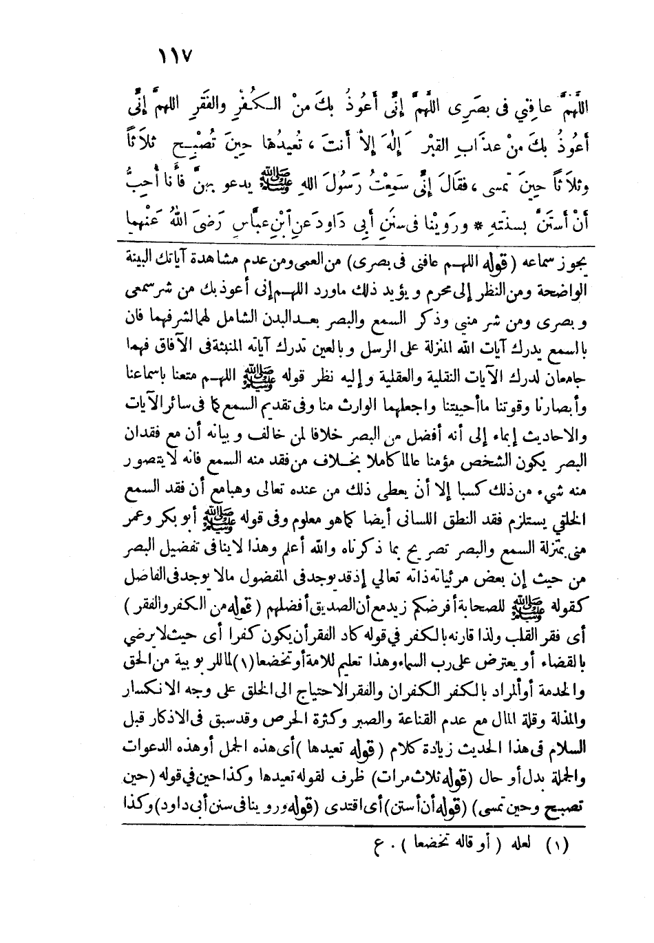 إن بعض مرئياته ذاته تعالى إذ قد يوجد في المفضول ما لا يوجد في الفاضل كقوله - صلى الله عليه وسلم - للصحابة أفرضكم زيد مع أن الصديق أفضلهم. قوله: (منْ الكُفْرِ والفَقرِ) أي فقر القلب ولذا قارنه بالكفر في قوله كاد الفقر أن يكون كفرًا أي حيث لا يرضى بالقضاء أو يعترض على رب السماء وهذا تعليم للأمة أو تخضعًا لما للربوبية من الحق والخدمة أو المراد بالكفر الكفران والفقر الاحتياج إلى الخلق على وجه الانكسار والمذلة وقلة المال مع عدم القناعة والصبر وكثرة الحرص وقد سبق في الأذكار قبل السلام في هذا الحديث زيادة كلام. قوله: (تُعيدُها) أي هذه الجمل أو هذه الدعوات والجملة بدل أو حال. قوله: (ثلاثَ مَرَّات) ظرف لقوله تعيدها وكذا حين في قوله. قوله: (حِينَ تُصبِح وحِينَ تمسي) قوله: (أَنْ أَستَنَّ) أي اقتدي.