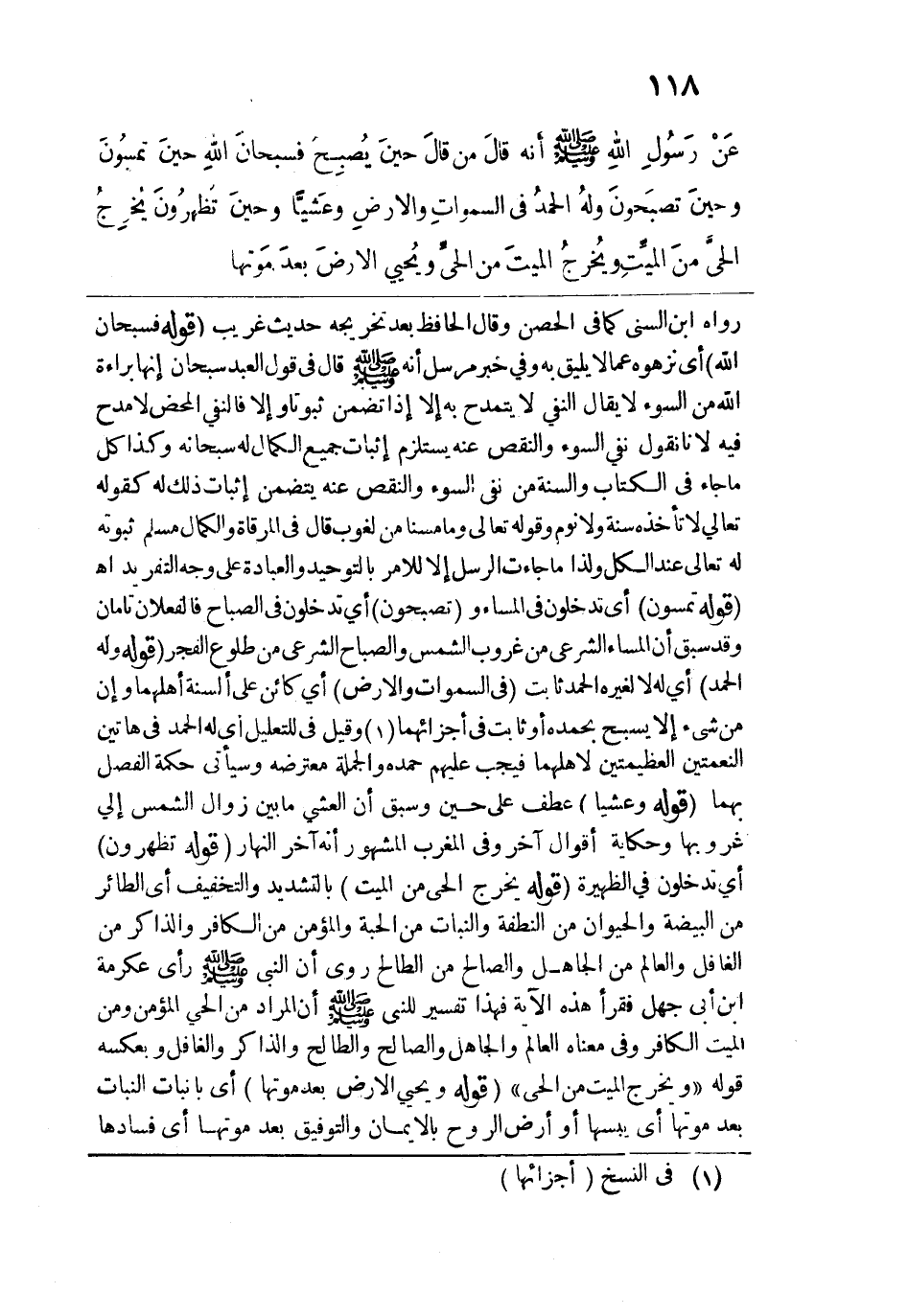 رواه ابن السني كما في الحصين وقال الحافظ بعد تخريجه حديث غريب. قوله: (فسبحانَ الله) أي نزهوه عما لا يليق به وفي خبر مرسل أنه - صلى الله عليه وسلم - قال في قول العبد سبحان إنها براءة الله من السوء لا يقال النفي لا يتمدح به إلّا إذا تضمن ثبوتًا إلَّا فالنفي المحض لا مدح فيه لأنا نقول نفي السوء والنقص عنه يستلزم إثبات جميع الكمال له سبحانه وكذا كل ما جاء في الكتاب والسنة من نفي السوء والنقص عنه يتضمن إثبات ذلك له كقوله تعالى: ({لَا تَأْخُذُهُ سِنَةٌ وَلَا نَوْمٌ} [البقرة: 255] {وَمَا مَسَّنَا مِنْ لُغُوبٍ (38)} [ق: 38] قال في المرقاة والكمال مسلم ثبوته له تعالى عند الكل ولذا ما جاءت الرسل إلَّا للأمر بالتوحيد والعبادة على وجه التفريد اهـ. قوله: (تمسُونَ) أي تدخلون في المساء و (تصبحونَ) أي تدخلون في الصباح فالفعلان تامان وقد سبق أن المساء الشرعي من غروب الشمس والصباح الشرعي من طلوع الفجر. قوله: (ولهُ الحمدُ) أي له لا لغيره الحمد ثابت (في السمواتِ والأرضِ) أي كائن على ألسنة أهلهما وإن من شيء إلا يسبح بحمده أو ثابت في أجزائهما وقيل في للتعليل أي له الحمد في هاتين النعمتين العظيمتين لأهلهما فيجب عليهم حمده والجملة معترضة وسيأتي حكمة الفصل بهما. قوله: (وعَشيًّا) عطف على حين وسبق أن العشي ما بين زوال الشمس إلى غروبها وحكاية أقوال آخر وفي المغرب المشهور أنه آخر النهار. قوله: (تَظهرُونَ) أي تدخلون في الظهيرة. قوله: (يُخرِجُ الحي منَ الميتِ) بالتشديد والتخفيف أي الطائر من البيضة والحيوان من النطفة والنبات من الحبة والمؤمن من الكافر والذاكر من الغافل والعالم من الجاهل والصالح من الطالح روي أن النبي - صلى الله عليه وسلم - رأى عكرمة بن أبي جهل فقرأ هذه الآية فهذا تفسير للنبي - صلى الله عليه وسلم - أن المراد من الحي المؤمن ومن الميت الكافر وفي معناه العالم والجاهل والصالح والطالح والذاكر والغافل وبعكسه قوله "ويخرج الميت من الحي". قوله: (ويُحيي الأرضَ بعدَ مَوتها) أي بإنبات