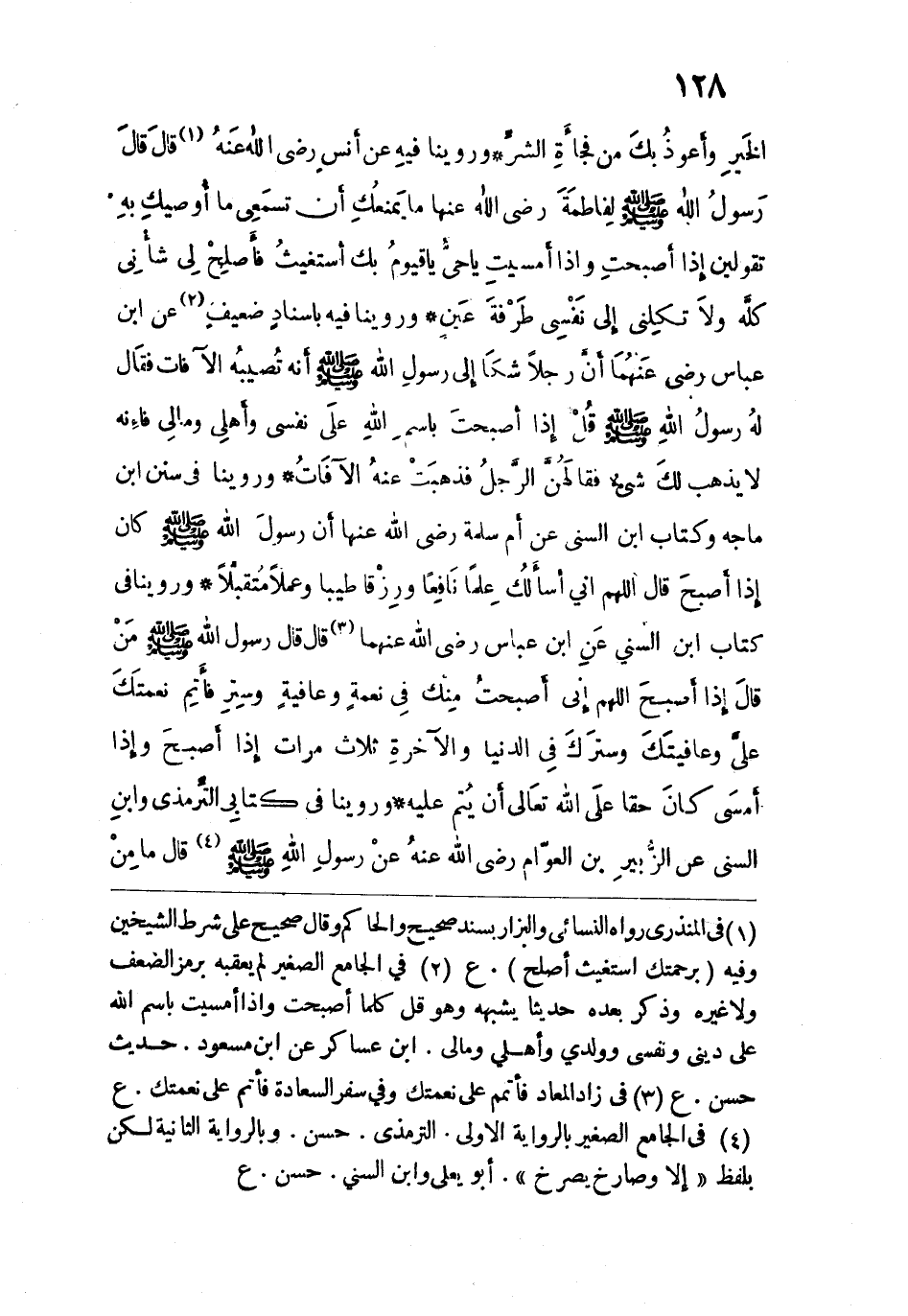 وروينا في كتاب ابن السني، عن ابن عباس رضي الله عنهما، قال: قال رسول الله - صلى الله عليه وسلم -: "من قال إذَا أصْبَحَ: اللهُم إنِّي أصْبَحْتُ مِنْكَ في نِعْمَةٍ وعَافِيةٍ وسِتْرٍ، فأتِمَّ نِعْمَتكَ عَليَّ وعافِيَتَكَ وسِتْرَكَ في الدُّنْيا والآخِرَةِ ثَلاثَ مَراتٍ إذا أصْبَحَ وإذا أمْسى، كان حَقًّا على اللهِ تعالى أنْ يُتِمَّ عَلَيْهِ".