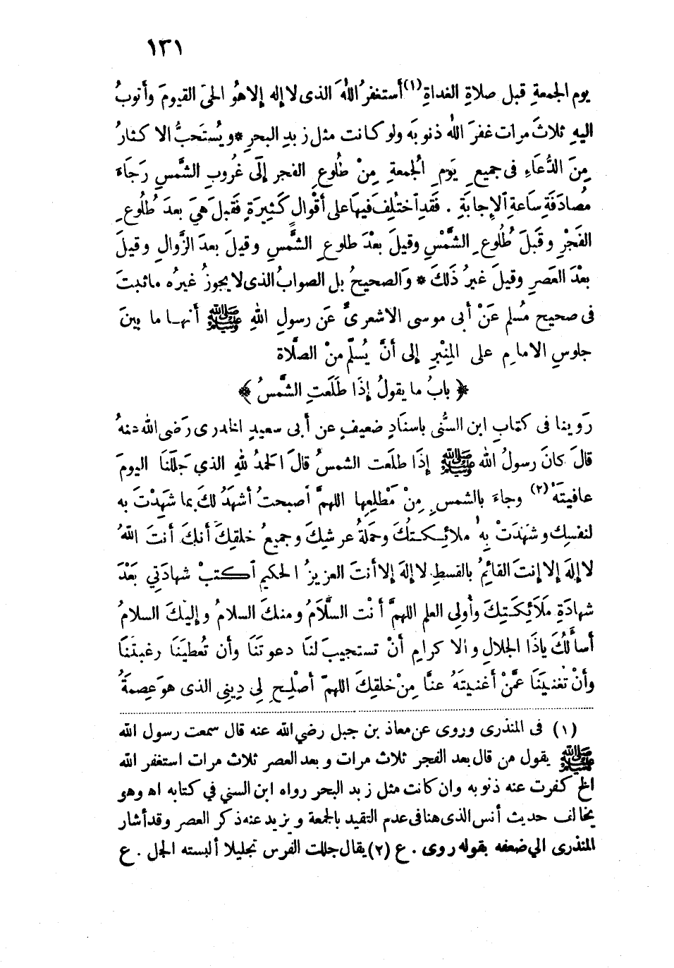 روينا في كتاب ابن السني بإسناد ضعيف، عن أبي سعيد الخدريّ رضي الله عنه، قال: كان رسول الله - صلى الله عليه وسلم - إذا طلعت الشمس قال: "الحَمْدُ للهِ الذي جلَّلنَا اليَوْمَ عافِيَتَهُ، وجاءَ بالشَّمْس مِنْ مَطْلِعِها، اللهُم أصْبَحتُ أشْهَدُ لَكَ بمَا شَهِدتَ بِهِ لِنَفْسِكَ، وَشَهِدَتْ به مَلائِكَتُكَ وَحَمَلَةُ عَرْشِكَ وَجَمِيعُ خَلْقِكَ أنكَ أنْتَ اللهُ لا إلهَ إلَّا أنْتَ القَائِمُ بالْقِسْطِ، لا إلهَ إلا أنْتَ العَزِيزُ الحَكِيمُ، اكْتُبْ شَهَادَتي بَعْدَ شَهَادَةِ مَلائِكَتِكَ وأولي العِلْم، اللهُم أنْتَ السلامُ ومِنْكَ السلامُ وإلَيكَ السلامُ، أسألُك يا ذَا الجَلالِ والإكرَامِ أن تَستَجيبَ لَنَا دَعْوَتَنا، وأنْ تُعْطِيَنا رغْبَتَنَا، وأنْ تُغْنِيَنَا عَمَّنْ أغْنَيتَهُ عَنَّا مِنْ خَلْقِكَ، اللهُم أصْلِحْ لي دَيني الذي هُوَ عِصْمَةُ