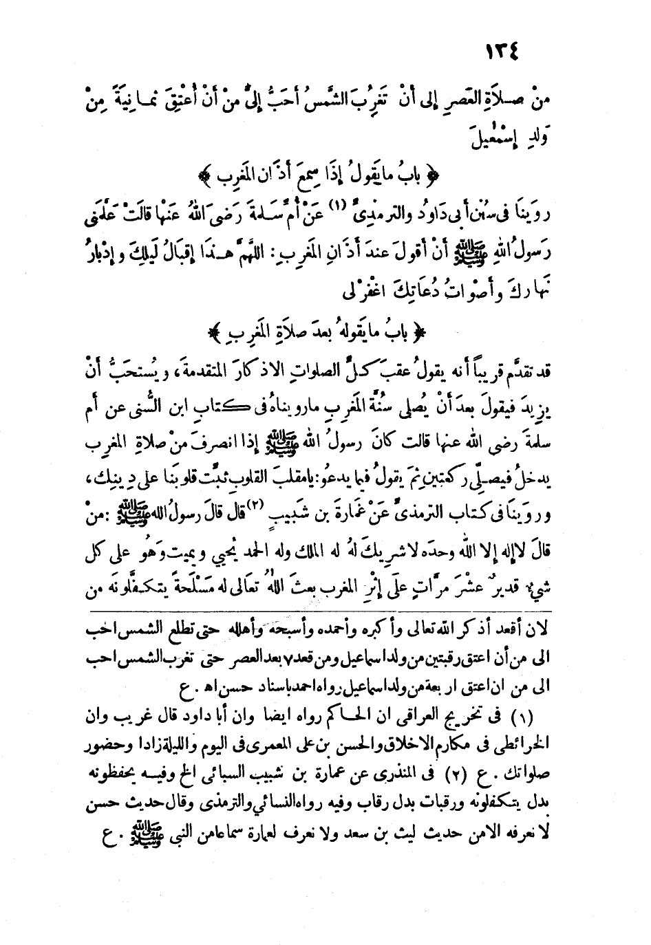 وروينا في كتاب الترمذي، عن عمارة بن شبيب، قال: قال رسول الله - صلى الله عليه وسلم -: "من قال: لا إلهَ إلا اللهُ وحْدَهُ لا شريكَ له، لهُ المُلْكُ ولَهُ الحَمْدُ يُحْيِي ويُمِيتُ وهوَ على كُل شيءٍ قَدِيرٌ عَشْرَ مَراتٍ على أثَرِ المَغْرِب، بعثَ اللهُ تعالى له مَسْلَحَةً يتكفَّلونَه من