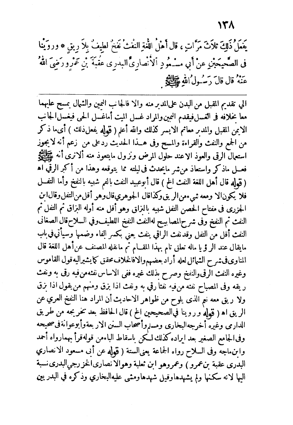 إلى تقديم المقبل من البدن على المدبر منه وإلّا فالجانب اليمين والشمال يمسح عليهما معًا بخلافه في الغسل فيقدم اليمين والمراد غسل الميت أما غسل الحي فيغسل الجانب الأيمن المقبل والمدبر معًا ثم الأيسر كذلك والله أعلم. قوله: (يَفَعَلُ ذَلِكَ) أي ما ذكر من الجمع والنفث والقراءة والمسح وفي هذا الحديث رد على من زعم أنه لا يجوز استعمال الرقي والعوذ إلّا عند حلول المرض ونزول ما يتعوذ منه ألا ترى أنه - صلى الله عليه وسلم - فعل ما ذكر واستعاذ من شر ما يحدث في ليلته مما يتوقعه وهذا من أكبر الرقى اهـ. قوله: (قَال أهْلُ اللغةِ النّفثُ الخ) قال أبو عبيد النفث بالفم شبيه بالنفخ وأما التفل فلا يكون إلّا ومعه شيء من الريق وكذا قال الجوهري قال وهو أقل من التفل وقال ابن الجزري في مفتاح الحصين التفل شبيه بالبزاق وهو أقل منه أوله البزاق ثم التفل ثم النفث ثم النفخ وفي شرح