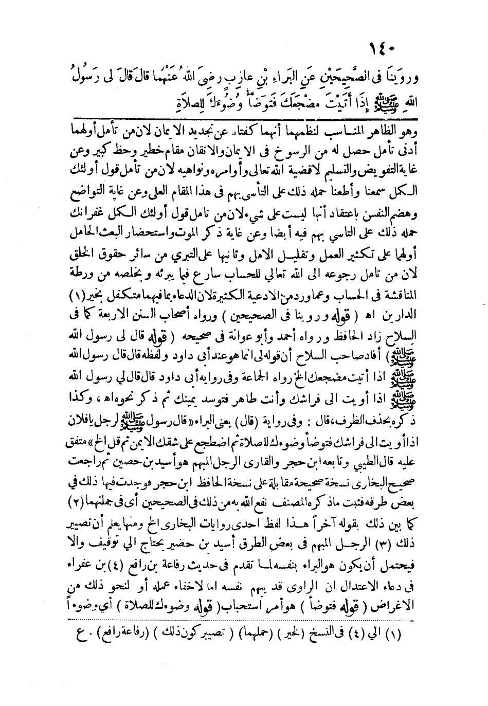 قوله: (وَرَوَينَا في الصَّحِيحَيْنِ) ورواه أصحاب السنن الأربعة كما في السلاح زاد الحافظ ورواه أحمد وأبو عوانة في صحيحه. قوله: (قَال لي رَسُولُ الله - صلى الله عليه وسلم -) أفاد صاحب السلاح أن قوله بي إنما هو عند أبي داود ولفظه قال قال رسول الله - صلى الله عليه وسلم - إذا أتيت مضجعك الخ، رواه الجماعة وفي رواية أبي داود قال قال لي رسول الله - صلى الله عليه وسلم - إذا أويت إلى فراشك وأنت طاهر فتوسد يمينك ثم ذكر نحوه اهـ، وكذا ذكره بحذف الظرف، قال: وفي رواية (قَال) يعني البراء "قال رسول الله - صلى الله عليه وسلم - لرجل يا فلان إذا أويت إلى فراشك فتوضأ وضوءك للصلاة ثم اضطجع على شقك الأيمن ثم قل الخ" متفق عليه قال الطيبي وتابعه ابن حجر والقاري الرجل المبهم هو أسيد بن حضير ثم راجعت صحيح البخاري نسخة صحيحة مقابلة على نسخة الحافظ ابن حجر فوجدت فيها ذلك في بعض طرقه فثبت ما ذكره المصنف نفع الله به من ذلك في الصحيحين أي في جملتهما كما بين ذلك بقوله آخرًا هذا لفظ إحدى روايات البخاري الخ، ومنها يعلم أن تصيير ذلك الرجل المبهم في بعض الطرق أسيد بن حضير يحتاج إلى توقيف وإلّا فيحتمل أن يكون هو البراء بنفسه لما تقدم في حديث رفاعة بن رافع ابن عفراء في دعاء الاعتدال أن الراوي قد يبهم نفسه إما لإخفاء عمله أو لنحو ذلك من الأغراض. قوله: (فَتوَضَّأْ) هو أمر استحباب. قوله: (وُضُوءَكَ لِلصلاةِ) أي وضوءًا