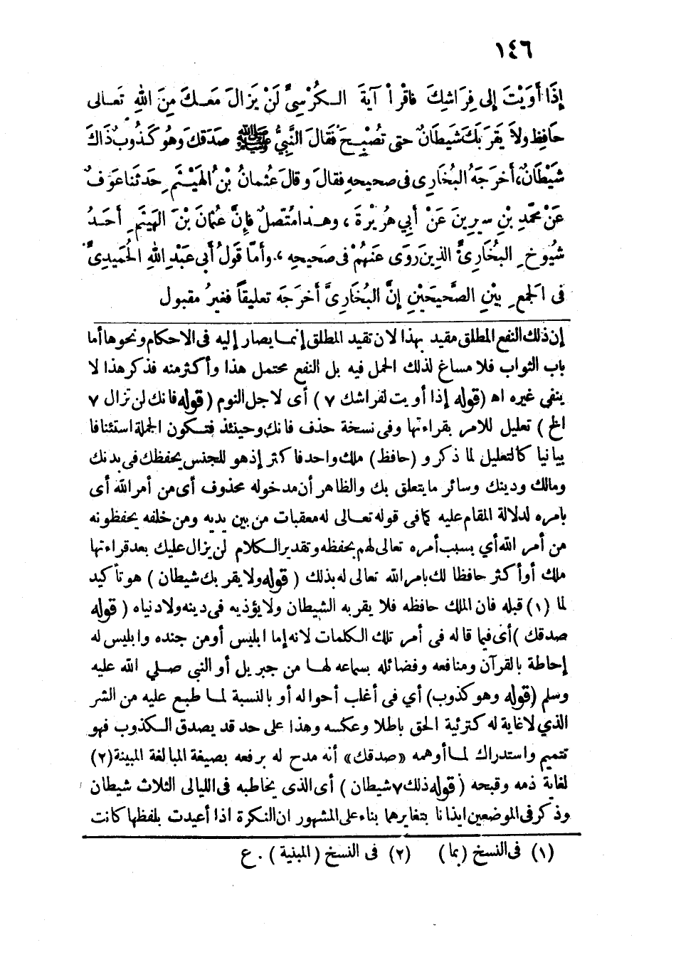 "إذا أويت إلى فراشك فاقرأ آية الكرسي، فإنه لن يزال معك من الله تعالى حافظ، ولا يقربك شيطان حتى تصبح، فقال النبي - صلى الله عليه وسلم -: صَدَقَكَ وهُوَ كَذوب، ذَاك شَيطان"، أخرجه البخاري في "صحيحه" فقال: وقال عثمان بن الهيثم: حدثنا عوف بن محمد بن سيرين، عن أبي هريرة، وهذا متصل، فإني عثمان بن الهيثم أحد شيوخ البخاري الذين روى عنهم في "صحيحه"، وأما قول أبي عبد الله الحميدي في "الجمع بين الصحيحين". إن البخاري أخرجه تعليقًا، فغير مقبول؛