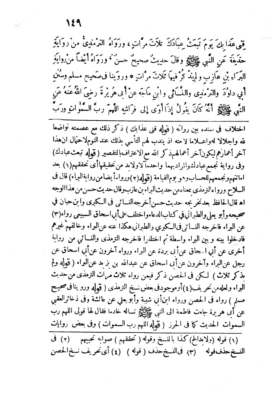 اختلاف في سنده بين رواته. قوله: (قِني عَذَابكَ) ذكر ذلك مع عصمته تواضعًا لله وإجلالًا له وإعلامًا لأمته إذ يندب لهم التأسي بذلك عند النوم لاحتمال أن هذا آخر أعمارهم ليكون آخر أعمالهم ذكر الله مع الاعتراف بالتقصير. قوله: (تبعَثُ عِبَادكَ) وفي رواية تجمع عبادك والمراد بهما واحد مآلًا ولا بد من تحقيقها أي تحققهم بعد إماتتهم وتجمعهم للحساب وهو يوم القيامة. قوله: (وَرَوَاهُ أَيْضًا منْ روايَةِ البَرَاءِ) قال في السلاح ورواه الترمذي بمعناه من حديث البراء بن عازب وقال حديث حسن من هذا الوجه اهـ. قال الحافظ بعد تخريجه حديث حسن أخرجه النسائي في الكبرى وابن حبان في صحيحه وأبو يعلى والطبراني في كتاب الدعاء واختلف على أبي إسحاق السبيعي رواه عن البراء فأخرجه النسائي في الكبرى والطبراني هكذا عنه عن البراء وخالفهم غيرهم فادخلوا بينه وبين البراء واسطة ثم اختلفوا فأخرجه الترمذي والنسائي من رواية أخرى عن أبي إسحاق عن أبي بردة عن البراء ورواه آخرون عن أبي إسحاق عن رجل عن البراء وآخرون عن أبي إسحاق عن عبد الله بن يزيد عن البراء. قوله: (ولمْ يذْكر ثلاثَ) لكن في الحصين ذكر فيمن رواه ثلاث مرات الترمذي من حديث البراء ولعله من تحريف أو موجود في بعض نسخ الترمذي. قوله: (وَرَوَينَا في صَحيح مُسلم) رواه في الحصين ورواه ابن أبي شيبة وأبو يعلى عن عائشة وفي ذخائر العقبى عن أبي هريرة جاءت فاطمة إلى النبي - صلى الله عليه وسلم - تسأله خادمًا فقال لها قولي اللهم رب السموات، الحديث كما في الحرز. قوله: (اللهم رب السمواتِ) وفي