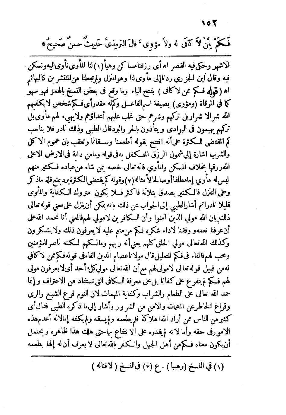 الأشهر وحكي فيه القصر اهـ. أي رزقنا مساكن وهيأ لنا المأوى نأوي إليه ونسكن فيه وقال ابن الجزري ردنا إلى مأوى لنا وهو المنزل ولم يجعلنا من المنتشرين كالبهائم اهـ. قوله: (فكم ممَّنْ لَا كَافي) بفتح الياء وما وقع في بعض النسخ بالهمز فهو سهو كما في المرقاة. قوله: (ومؤوي) بصيغة اسم الفاعل وكم له مقدر أي فكم شخص لا يكفيهم الله شر الأشرار بل تركهم وشرهم حتى غلب عليهم أعداؤهم ولا يهيئ لهم مأوى بل تركهم يهيمون في البوادي ويتأذون بالحر والبرد قال الطيبي وذلك نادر فلا يناسب كم المقتضى للكثرة على أنه افتتح بقوله أطعمنا وسقانا وتعقب بأن عموم الأكل والشراب إشارة إلى شمول الرزق المتكفل به في قوله: ({وَمَا مِنْ دَابَّةٍ فِي الْأَرْضِ إلا عَلَى اللَّهِ رِزْقُهَا} [هود: 6] بخلاف المسكن والمأوى فإنه تعالى خصه بمن شاء من عباده فكثير منهم ليس له مأوى إما مطلقًا أو صالحًا لأمثاله وقوله كم يقتضي الكثرة يرد بمنع قلة ما ذكر وعلى التنزل فالكثير يصدق بثلاثة فأكثر فلا يكون متروك الكفاية والمأوى قليلًا نادرًا ثم أشار الطيبي إلى الجواب عن ذلك بأنه يمكن أن ينزل على معنى قوله تعالى: {ذَلِكَ بِأَنَّ اللَّهَ مَوْلَى الَّذِينَ آمَنُوا وَأَنَّ الْكَافِرِينَ لَا مَوْلَى لَهُمْ (11)} [محمد: 11] فالمعنى أنا نحمد الله على أن عرفنا نعمه ووفقنا لأداء شكره فكم من منعم عليه لا يعرفون ذلك ولا يشكرون وكذلك الله تعالى مولى الخلق كلهم يعني أنه ربهم ومالكهم لكنه ناصر للمؤمنين ومحب لهم فالفاء في فكم للتعليل قال مولانا عصام الدين الفاء في قوله فكم ممن لا كافي له من قبيل قوله تعالى: {لَا مَولى لَهُم} مع أن الله تعالى مولى كل أحد أي لا يعرفون مولى لهم فكم لم يتفرع على كفانا بل على معرفة الكافي التي تستفاد من الاعتراف وإنما حمد الله تعالى على الطعام والشراب وكفاية المهمات لأن النوم فرع الشبع والري وفراغ الخاطر عن المهمات والأمن من الشرور وأشار إلى ما ذكره الطيبي فقال أي كثير من الناس ممن أراد الله اهلاكه فلم يطعمه ولم يسقه ولم يكفه إما لأنه أعدم هذه الأمور في حقه وأما لأنه لم يقدره على الانتفاع بها حتى هلك هذا ظاهره ويحتمل أن يكون معناه فكم من أهل الجهل والكفر بالله تعالى لا يعرف أن له إلهًا يطعمه