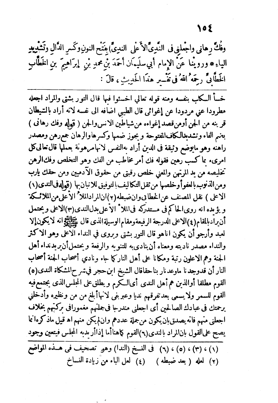 وفُكَّ رِهاني، واجْعَلْني في النَّديِّ الأعلى". الندي: بفتح النون وكسر الدال وتشديد الياء.