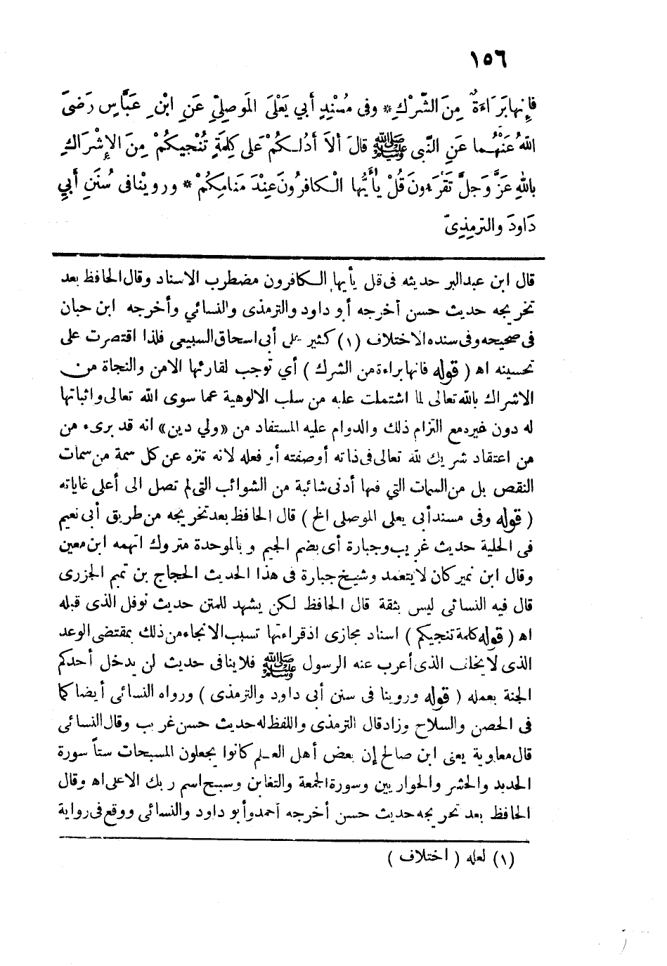 قال ابن عبد البر حديثه في {قُلْ يَا أَيُّهَا الْكَافِرُونَ (1)} [الكافرون: 1] مضطرب الإسناد وقال الحافظ بعد تخريجه حديث حسن أخرجه أبو داود والترمذي والنسائي وأخرجه ابن حبان في صحيحه وفي سنده الاختلاف كثير على أبي إسحاق السبيعي فلذا اقتصرت على تحسينه اهـ. قوله: (فإِنها بَرَاءَة مِنَ الشرْكِ) أي توجب لقارئها الأمن والنجاة من الإشراك بالله تعالى لما اشتملت عليه من سلب الألوهية عما سوى الله تعالى وإثباتها له دون غيره مع التزام ذلك والدوام عليه المستفاد من "ولي دين" إنه قد برئ من، من اعتقاد شريك لله تعالى في ذاته أو صفته أو فعله لأنه تنزه عن كل سمة من سمات النقص بل من السمات التي فيها أدنى شائبة من الشوائب التي لم تصل إلى أعلى غاياته.