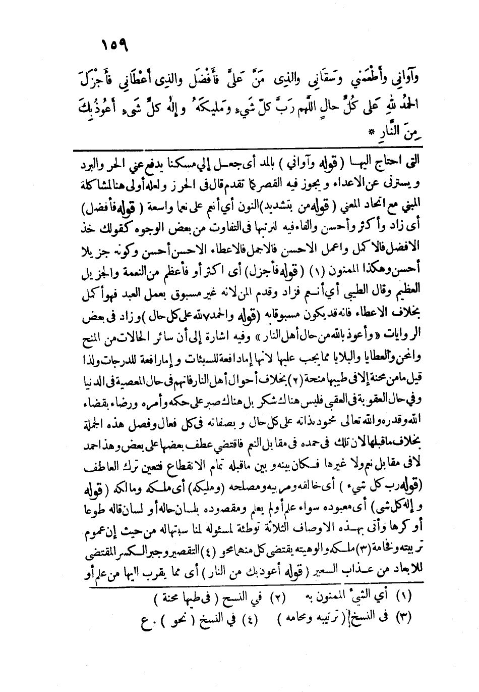 وآوَاني وأطْعَمَني وسَقاني، والذي مَنَّ علي فافْضَل، والذِي أعْطَاني فأجْزَل، الحَمْدُ للهِ عَلى كل حالٍ اللهُم رَب كل شَيءٍ ومَلِيكَهُ، وإلهَ كل شَيءٍ أعُوذ بِكَ مِنَ النَّارِ".