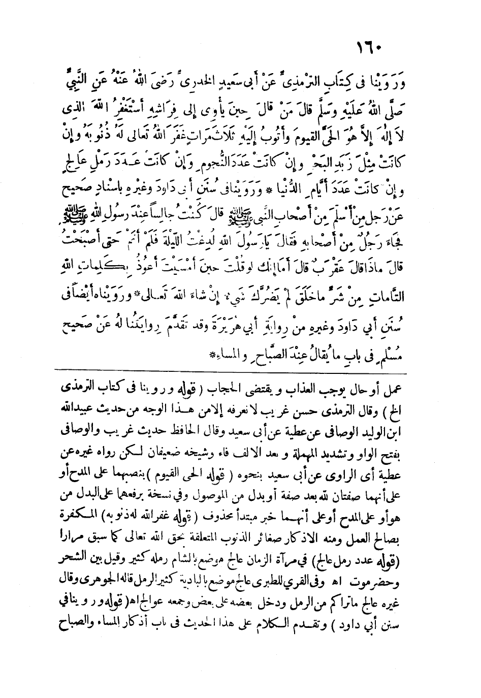 وروينا في كتاب الترمذي، عن أبي سعيد الخدري رضي الله عنه، عن النبي - صلى الله عليه وسلم - قال: "مَنْ قال حِينَ يأوي إلى فِراشِهِ: أستَغْفِر الله الذي لَا إلهَ إلَّا هُوَ الحَي القَيُّومُ وَأتُوبُ إلَيهِ ثَلاثَ مراتٍ غَفَرَ اللهُ تعالى لهُ ذُنُوبَهُ وإنْ كانَتْ مِثْلَ زَبدِ البَحْرِ، وإنْ كانت عَدَدَ النجومِ، وإنْ كانتْ عَددَ رمْلِ عالِجٍ، وإنْ كانتْ عَدَد أيّام الدنْيا".