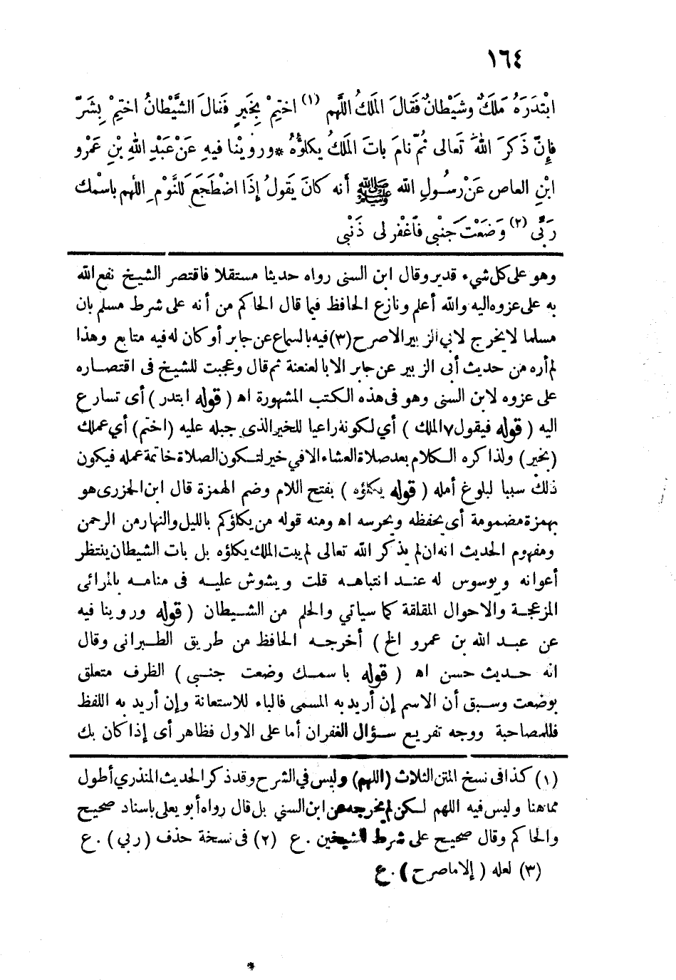 وهو على كل شيء قدير وقال ابن السني رواه حديثًا مستقلًا فاقتصر الشيخ نفع الله به على عزوه إليه والله أعلم، ونازع الحافظ فيما قال الحاكم من أنه على شرط مسلم بأن مسلمًا لا يخرج لأبي الزبير الأصرح فيه بالسماع عن جابر أو كان له فيه متابع وهذا لم أره من حديث أبي الزبير عن جابر إلَّا بالعنعنة ثم قال وعجبت للشيخ في اقتصاره على عزوه لابن السني وهو في هذه الكتب المشهورة اهـ. قوله: (ابْتدَرَ) أي تسارع إليه. قوله: (فَيقُول المَلكُ) أي لكونه راعيًا للخير الذي جبله عليه (اخِتمْ) أي عملك (بخَيرٍ) ولذاكره الكلام بعد صلاة العشاء إلَّا في خير لتكون الصلاة خاتمة عمله فيكون ذلك سببًا لبلوغ أمله. قوله: (يكلؤُهُ) بفتح اللام وضم الهمزة قال ابن الجزري هو بهمزة مضمومة أي يحفظه ويحرسه اهـ، ومنه قوله من يكلؤكم بالليل والنهار من الرحمن ومفهوم الحديث أنه أن لم يذكر الله تعالى لم يبت الملك يكلؤه بل بات الشيطان ينتظر أعوانه ويوسوس له عند انتباهه قلت ويشوش عليه في منامه بالمرائي المزعجة والأحوال المقلقة كما سيأتي والحلم من الشيطان. قوله: (وَرَوَينْا فيهِ عَنْ عَبْدِ الله بْنِ عَمْرو الخ) أخرجه الحافظ من طريق الطبراني وقال أنه حديث حسن اهـ. قوله: (باسْمك رَبّي وَضَعْتَ جَنْبي) الظرف متعلق بوضعت وسبق أن الاسم إن أريد به المسمى فالباء للاستعانة وإن أريد به اللفظ فللمصاحبة ووجه تفريع سؤال الغفران أما على الأول فظاهر أي إذا كان بك