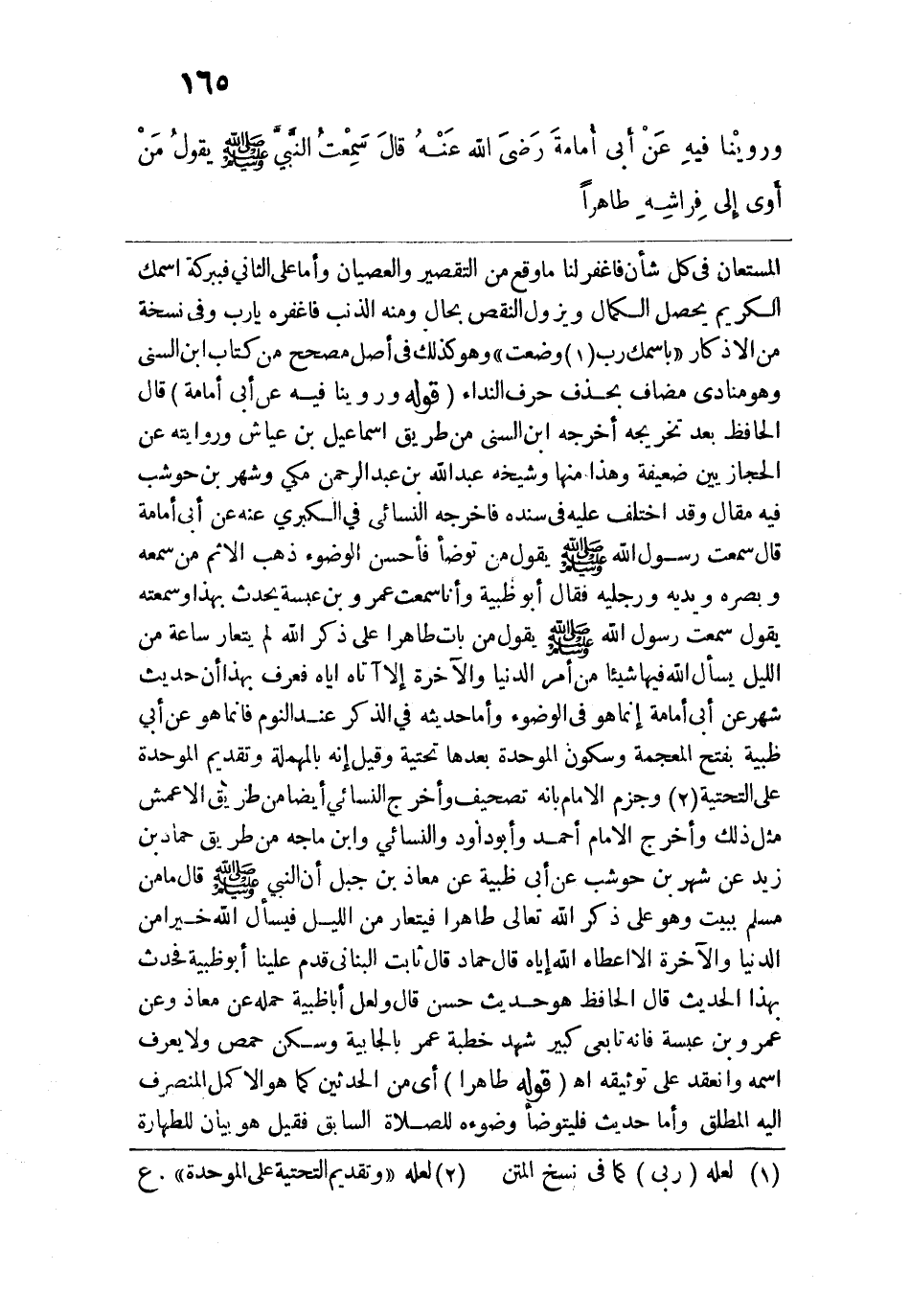 وروينا فيه عن أبي أمامة رضي الله عنه، قال: سمعت النبي - صلى الله عليه وسلم - يقول: "مَنْ أوى إلى فِراشِهِ طاهِرًا،