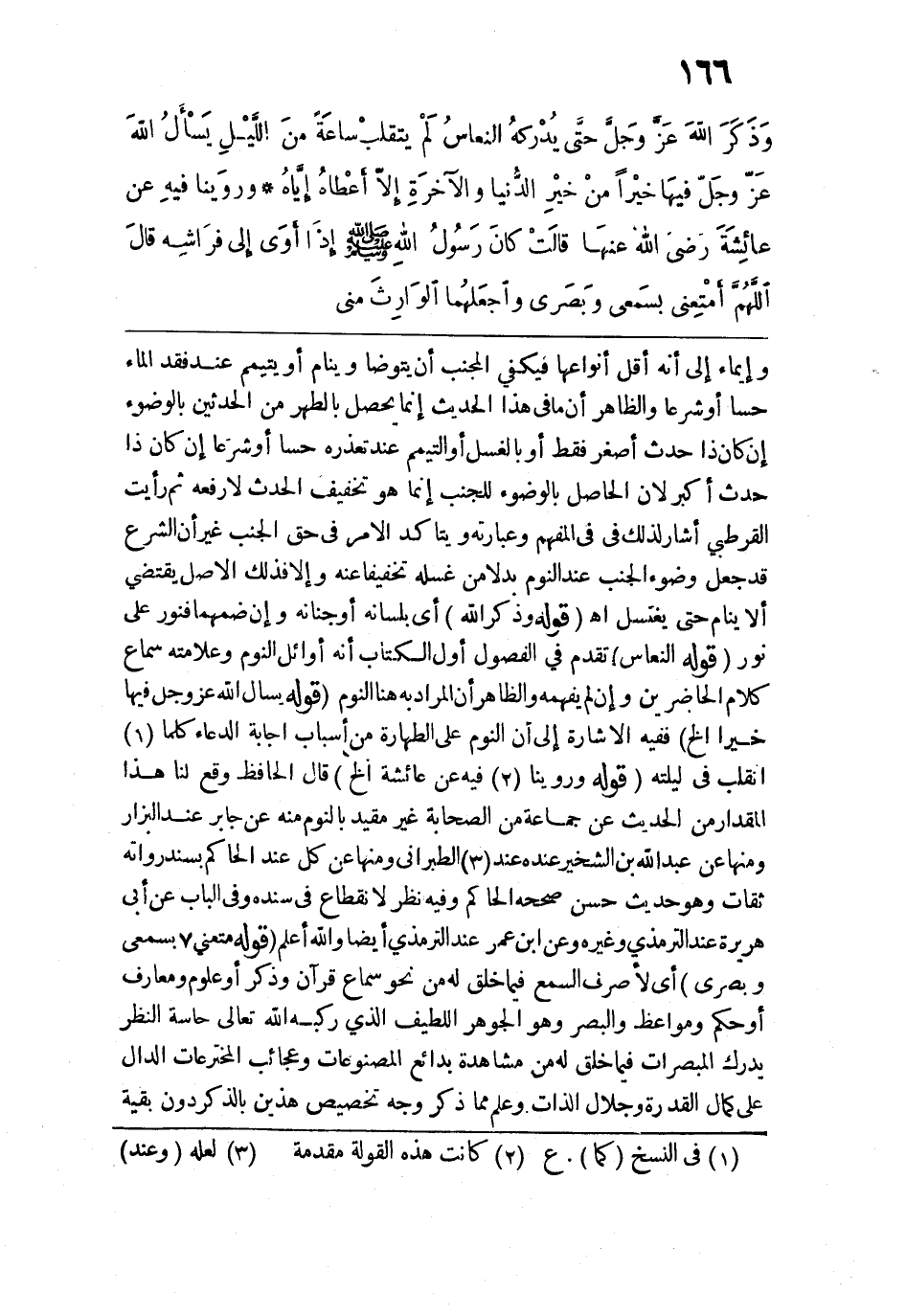 وإيماء إلى أنه أقل أنواعها فيكفي المجنب أن يتوضأ وينام أو يتيمم عند فقد الماء حسًّا أو شرعًا والظاهر أن ما في هذا الحديث إنما يحصل بالطهر من المحدثين بالوضوء إن كان ذا حدث أصغر فقط أو بالغسل أو التيمم عند تعذره حسًّا أو شرعًا إن كان ذا حدث أكبر لأن الحاصل بالوضوء للجنب إنما هو تخفيف الحدث لا رفعه ثم رأيت القرطبي أشار لذلك في المفهم وعبارته ويتأكد الأمر في حق الجنب غير أن الشرع قد جعل وضوء الجنب عند النوم بدلًا من غسله تخفيفًا عنه وإلا فذلك الأصل يقتضي ألا ينام حتى يغتسل اهـ. قوله (وَذَكَرَ الله) أي بلسانه أو جنانه وإن ضمهما فنور على نور. قوله: (النعاسُ) تقدم في الفصول أول الكتاب أنه أوائل النوم وعلامته سماع كلام الحاضرين وإن لم يفهمه والظاهر أن المراد به هنا النوم. قوله: (يَسْأَلُ الله عَز وجَلّ فيهَا خيْرًا الخ) ففيه الإشارة إلى أن النوم على الطهارة من أسباب إجابة الدعاء كلما انقلب في ليلته. قوله: (وَرَوَينا فيهِ عَن عائِشَةَ الخ) قال الحافظ وقع لنا هذا المقدار من الحديث عن جماعة من الصحابة غير مقيد بالنوم منه عن جابر عند البزار ومنها عن عبد الله بن الشخير عنده عند الطبراني ومنها عن كل عند الحاكم بسند رواته ثقات وهو حديث حسن صححه الحاكم وفيه نظر لانقطاع في سنده وفي الباب عن أبي هريرة عند الترمذي وغيره وعن ابن عمر عند الترمذي أيضًا والله أعلم. قوله: (أمْتِعني بسَمعي وبَصَري) أي لأصرف السمع فيما خلق له من نحو سماع قرآن وذكر أو علوم ومعارف أو حكم ومواعظ والبصر وهو الجوهر اللطيف الذي ركبه الله تعالى حاسة النظر يدرك المبصرات فيما خلق له من مشاهدة بدائع المصنوعات وعجائب المخترعات الدال على كمال القدرة وجلال الذات وعلم مما ذكر وجه تخصيص هذين بالذكر دون بقية