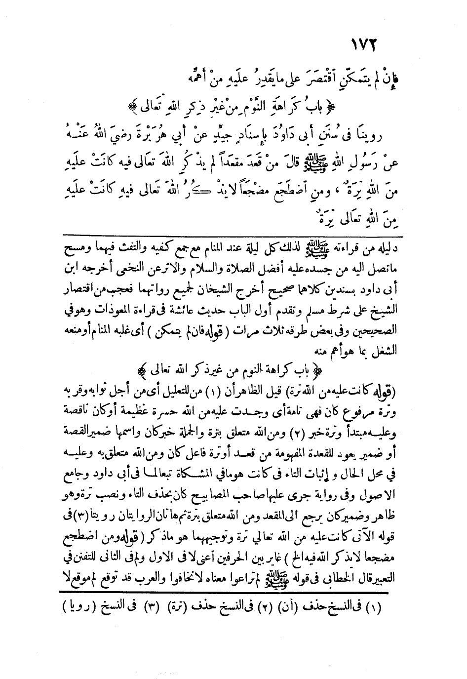 دليله من قراءته - صلى الله عليه وسلم - لذلك كل ليلة عند المنام مع جمع كفيه والتفث فيهما ومسح ما تصل إليه من جسده عليه أفضل الصلاة والسلام والأثر عن النخعي أخرجه ابن أبي داود بسندين كلاهما صحيح أخرج الشيخان لجميع رواتهما فعجب من اقتصار الشيخ على شرط مسلم وتقدم أول الباب حديث عائشة في قراءة المعوذات وهو في الصحيحين وفي بعض طرقه ثلاث مرات. قوله: (فإِنَّ لمْ يَتَمكَّن) أي غلبه المنام أو منعه الشغل بما هو أهم منه.