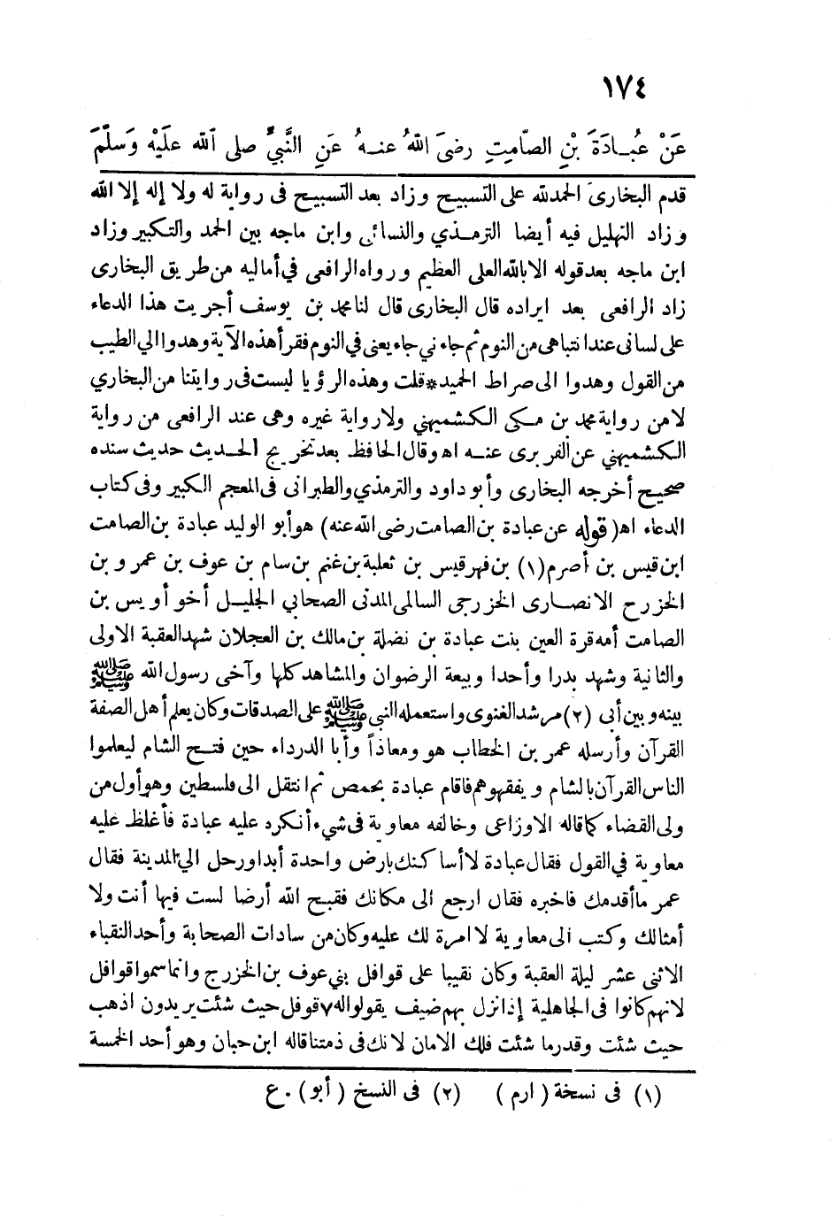 قلت وهذه الرؤيا ليست في روايتنا من البخاري لا من رواية محمد بن مكي الكشميهني ولا رواية غيره وهي عند الرافعي من رواية الكشميهني عن الفربري عنه اهـ، وقال الحافظ بعد تخريج الحديث حديث سنده صحيح أخرجه البخاري وأبو داود والترمذي والطبراني في المعجم الكبير وفي كتاب الدعاء اهـ. قوله: (عَنْ عُبادَةَ بْنِ الصّامِتِ رضيَ الله عنهُ) هو أبو الوليد عبادة بن الصامت بن قيس بن أصرم بن فهر قيس بن ثعلبة بن غنم بن سام بن عوف بن عمرو بن الخزرج الأنصاري الخزرجي السالمي المدني الصحابي الجليل أخو أويس بن الصامت أمه قرة العين بنت عبادة بن نضلة بن مالك بن العجلان شهد العقبة الأولى والثانية وشهد بدرًا وأحدًا وبيعة الرضوان والمشاهد كلها