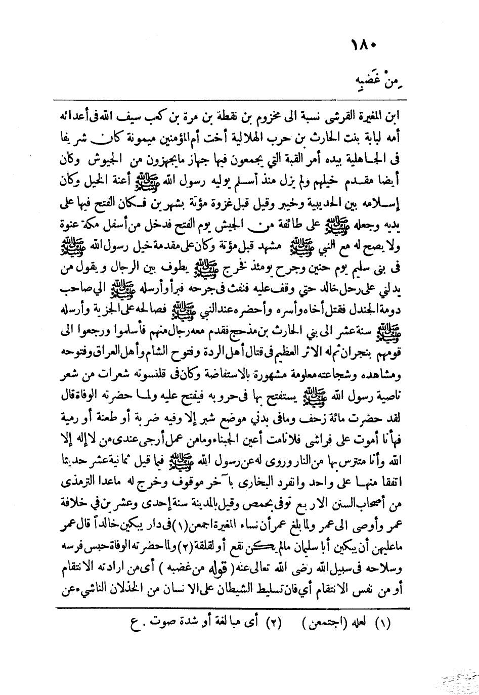 بن المغيرة القرشي نسبة إلى مخزوم بن نقطة بن مرة بن كعب سيف الله في أعدائه أمه لبابة بنت الحارث بن حرب الهلالية أخت أم المؤمنين ميمونة كان شريفًا في الجاهلية بيده أمر القبة التي يجمعون فيها جهاز ما يجهزون من الجيوش وكان أيضًا مقدم خيلهم ولم يزل منذ أسلم يوليه رسول الله - صلى الله عليه وسلم - أعنة الخيل وكان إسلامه بين الحديبية وخيبر وقيل قبل غزوة مؤتة بشهرين فكان الفتح فيها على يديه وجعله - صلى الله عليه وسلم - على طائفة من الجيش يوم الفتح فدخل من أسفل مكة عنوة ولا يصح له مع النبي - صلى الله عليه وسلم - مشهد قبل مؤتة وكان على مقدمة خيل رسول الله - صلى الله عليه وسلم - في بني سليم يوم حنين وجرح يومئذٍ فخرج - صلى الله عليه وسلم - يطوف بين الرجال ويقول من يدلني على رحل خالد حتى وقف عليه فنفث في جرحه فبرأ وأرسله - صلى الله عليه وسلم - إلى صاحب دومة الجندل فقتل أخاه وأسره وأحضره عند النبي - صلى الله عليه وسلم - فصالحه على الجزية وأرسله - صلى الله عليه وسلم - سنة عشر إلى بني الحارث بن مذحج فقدم معه رجال منهم فأسلموا ورجعوا إلى قومهم بنجران ثم له الأثر العظيم في قتال أهل الردة وفتوح الشام وأهل العراق وفتوحه ومشاهده وشجاعته معلومة مشهورة بالاستفاضة وكان في قلنسوته شعرات من شعر ناصية رسول الله - صلى الله عليه وسلم - يستفتح بها في حروبه فيفتح عليه ولما حضرته الوفاة قال لقد حضرت مائة زحف وما في بدني موضع شبر إلَّا وفيه ضربة أو طعنة أو رمية فهأنا أموت على فراشي فلا نامت أعين الجبناء وما من عمل أرجى عندي من لا إله إلّا الله وأنا متترس بها من النار وروي له عن رسول الله - صلى الله عليه وسلم - فيما قيل ثمانية عشر حديثًا اتفقا منها على واحد وانفرد البخاري بآخر موقوف وخرج له ما عدا الترمذي من أصحاب السنن الأربع توفي بحمص وقيل بالمدينة سنة إحدى وعشرين في خلافة عمر وأوصى إلى عمر ولما بلغ عمر أن نساء المغيرة أجمعين في دار يبكين خالدًا قال عمر ما عليهن أن يبكين أبا سليمان ما لم يكن نقع أو لقلقة ولما حضرته الوفاة حبس فرسه وسلاحه في سبيل الله رضي