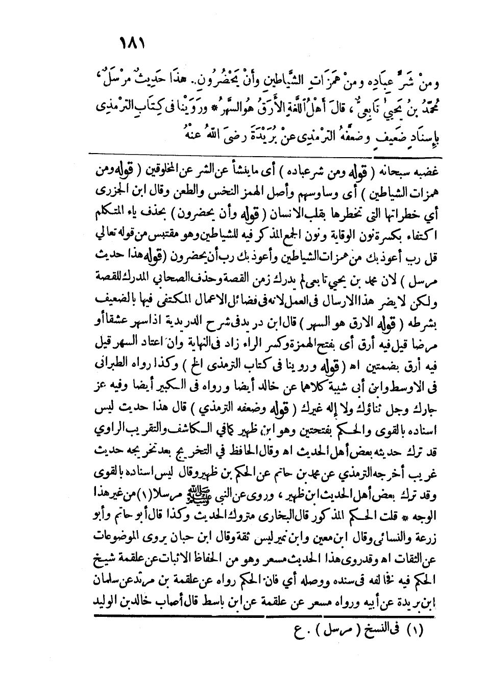 غضبه سبحانه. قوله: (ومنْ شَرّ عِبَادِه) أي ما ينشأ عن الشر عن المخلوقين. قوله: (ومنْ هَمَزَاتِ الشَّياطينِ) أي وساوسهم وأصل الهمز النخس والطعن وقال ابن الجزري أي خطراتها التي تخطرها بقلب الإنسان. قوله: (وأنْ يَحْضُرُونِ) بحذف ياء المتكلم اكتفاء بكسرة نون الوقاية ونون الجمع المذكر فيه للشياطين وهو مقتبس من قوله تعالى: ({وَقُلْ رَبِّ أَعُوذُ بِكَ مِنْ هَمَزَاتِ الشَّيَاطِينِ (97) وَأَعُوذُ بِكَ رَبِّ أَنْ يَحْضُرُونِ (98)} [المؤمنون: 97 - 98] وأعوذ بك رب أن يحضرون. قوله: (هذَا حَدِيث مرْسَل) لأن محمد ابن يحيى تابعي لم يدرك زمن القصة وحذف الصحابي المدرك للقصة ولكن لا يضر هذا الإرسال في العمل لأنه في فضائل الأعمال المكتفى فيها بالضعيف بشرطه. قوله: (الأَرَقُ هُو السَّهرُ) قال ابن دريد في شرح الدريدية إذا سهر عشقًا أو مرضًا قيل فيه أرق أي بفتح الهمزة وكسر الراء زاد في النهاية وإن اعتاد السهر قيل فيه أرق بضمتين اهـ.