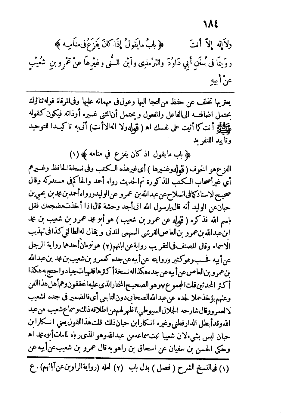 الفزع هو الخوف. قوله: (وغيْرِهَا) أي غير هذه الكتب وفي نسخة الحافظ وغيرهم أي غير أصحاب الكتب المذكورة ثم الحديث رواه أحمد والحاكم في مستدركه وقال صحيح الإسناد كما في السلاح عن عبد الله بن عمرو عن الوليد ورواه أحمد بن محمد بن يحيى بن حبان عن الوليد أنه قال يا رسول الله إني أجد وحشة قال إذا أخذت مضجعك فقل باسم الله فذكره. قوله: (عَنْ عَمْرِو بنِ شُعيْبٍ) هو أبو محمد عمرو بن شعيب بن محمد بن عبد الله بن عمرو بن العاص القرشي السهمي المدني ويقال له الطالقي كذا في تهذيب الأسماء وقال المصنف في التقريب رواية عن أبانهم هو نوعان أحدهما رواية الرجل عن أبيه فحسب وهو كثير وروايته عن أبيه عن جده كعمرو بن شعيب بن محمد بن عبد الله بن عمرو بن العاص عن أبيه عن جده هكذا له نسخة أكثرها فقهيات جياد واحتج به هكذا أكثر المحدثين قلت وفي المجموع وهو الصحيح المختار الذي عليه المحققون وهم أهل هذا الفن وعنهم يؤخذ حملًا لجده على عبد الله الصحابي دون التابعي أي فالضمير في جده لشعيب لا لعمرو وقال شارحه الجلال السيوطي لما ظهر لهم من إطلاقه ذلك وسماع شعيب من عبد الله وقد أبطل الدارقطني وغيره إنكار ابن حبان ذلك قلت هذا القول يعني إنكار ابن حبان ليس بشيء لأن شعيبًا ثبت سماعه من عبد الله وهو الذي رباه لما مات أبوه محمد اهـ، وحكى الحسن بن سفيان عن إسحاق بن راهويه قال عمرو بن شعيب عن أبيه عن