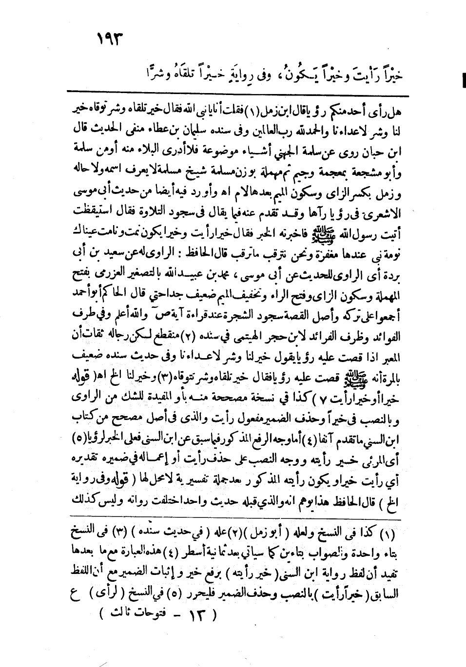 هل رأى أحد منكم رؤيا قال ابن زمل فقلت أنا يا نبي الله فقال خير تلقاه وشر توقاه خير لنا وشر لأعداءنا والحمد لله رب العالمين وفي سنده سليمان بن عطاء منفي الحديث قال ابن حبان روى عن سلمة الجهني أشياء موضوعة فلا أدري البلاء منه أو من سلمة وأبو مشجعة بمعجمة وجيم ثم مهملة بوزن مسلمة شيخ مسلمة لا يعرف اسمه ولا حاله وزمل بكسر الزاي وسكون الميم بعدها لام اهـ، وأورد فيه أيضًا من حديث أبي موسى الأشعري في رؤيا رآها وقد تقدم عنه فيما يقال في سجود التلاوة فقال استيقظت أتيت رسول الله - صلى الله عليه وسلم - فأخبرته الخبر فقال خيرًا رأيت وخيرًا يكون نمت ونامت عيناك نومة نبي عندها مغفرة ونحن نترقب ما ترقب قال الحافظ: الراوي له عن سعيد بن أبي بردة أي الراوي للحديث عن أبي موسى، محمد بن عبيد الله بالتصغير العزرمي بفتح المهملة وسكون الزاي وفتح الراء وتخفيف الميم ضعيف جدًّا حتى قال الحاكم أبو أحمد أجمعوا على تركه وأصل القصة سجود الشجرة عند قراءة آية ص والله أعلم، وفي طرف الفوائد وظرف الفرائد لابن حجر الهيتمي في سنده منقطع لكن رجاله ثقات أن المعبر إذا قصت عليه رؤيا يقول خير لنا وشر لأعداءنا وفي حديث سنده ضعيف بالمرة أنه - صلى الله عليه وسلم - قصت عليه رؤيا فقال خير تلقاه وشر تتوقاه وخير لنا الخ اهـ. قوله: (خيْرًا أَوْ خيْرًا رَأيتَ) كذا في نسخة مصححة منه بأو المفيدة للشك من الراوي وبالنصب في خيرًا وحذف الضمير مفعول رأيت والذي في أصل مصحح من كتاب ابن السني ما تقدم آنفًا أما وجه الرفع المذكور فيما سبق عن ابن السني فعلى الخبر لرؤيا أي المرئي خير رأيته ووجه النصب على حذف رأيت أو إعماله في ضميره تقديره أي رأيت خيرًا ويكون رأيته المذكور بعد جملة تفسيرية لا محل لها. قوله: (وفي رِوايَةِ الخ) قال الحافظ هذا يوهم