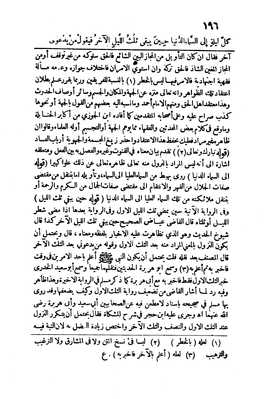 آخر فقال إن كان التأويل من المجاز البيِّن الشائع فالحق سلوكه من غير توقف أو من المجاز المعين الشاذ فالحق تركه وإن استوى الأمران فاختلاف جوازه وعدمه مسألة فقهية اجتهادية فالأمر فيها ليس بالخطر بالنسبة للفريقين وربما يقرر علم بطلان اعتقاد تلك الظواهر وإنه تعالى منزه عن الجهة والمكان والجسم وسائر أوصاف الحدوث وهذا معتقد أهل الحق ومنهم الإمام أحمد وما نسبه إليه بعضهم من القول بالجهة أو نحوها كذب صراح عليه وعلى أصحابه المتقدمين كما أفاده ابن الجوزي من أكابر الحنابلة وما وقع في كلام بعض المحدثين والفقهاء مما يوهم الجهة أو التجسيم أوله العلماء وقالوا أن ظاهره غير مراد فعليك بحفظ هذا الاعتقاد واحذر زيغ المجسمة والجهوية أرباب الفساد. قوله: (تبَاركَ وتعَالى) تقدم بيان معناه في القنوت وغيره والفصل به بين الفعل ومتعلقه إشارة إلى أنه ليس المراد بالنزول منه تعالى ظاهره تعالى عن ذلك علوا كبيرًا. قوله: (إِلى السماءِ الدُّنيا) روى يهبط من السماء العليا إلى السماء، وتأويله أما بتنقل من مقتضى صفات الجلال من القهر والانتقام إلى مقتضى صفات الجمال من الكرم والرحمة أو بتنقل ملائكته من تلك السماء العليا إلى السماء الدنيا. قوله: (حيِنَ يبقى ثُلثُ الليلِ) وفي الرواية الآتية حين يمضي ثلث الليل الأول وفي الرواية بعدها إذا مضى شطر الليل أو ثلثاه قال القاضي عياض الصحيح حين يبقي ثلث الليل الآخر كذا قال شيوخ الحديث وهو الذي تظاهرت عليه الأخبار بلفظه ومعناه، قال ويحتمل أن يكون النزول بالمعنى المراد منه بعد الثلث الأول وقوله من يدعوني بعد الثلث الآخر قال المصنف بعد نقله قلت يحتمل أن يكون النبي - صلى الله عليه وسلم - أعلم بأحد الأمرين في وقت فأخبر به ثم اعلم به وسمع أبو هريرة الحديثين فنقلهما جميعًا وسمع أبو سعيد الخدري خبر الثلث الأول فقط فأخبر به مع أبي هريرة كما ذكر مسلم في الرواية الأخيرة وهذا ظاهر وفيه رد لما أشار القاضي من تضعيف رواية الثلث الأول وكيف يضعفها وقد روى بها مسلم في صحيحه بإسناد لا