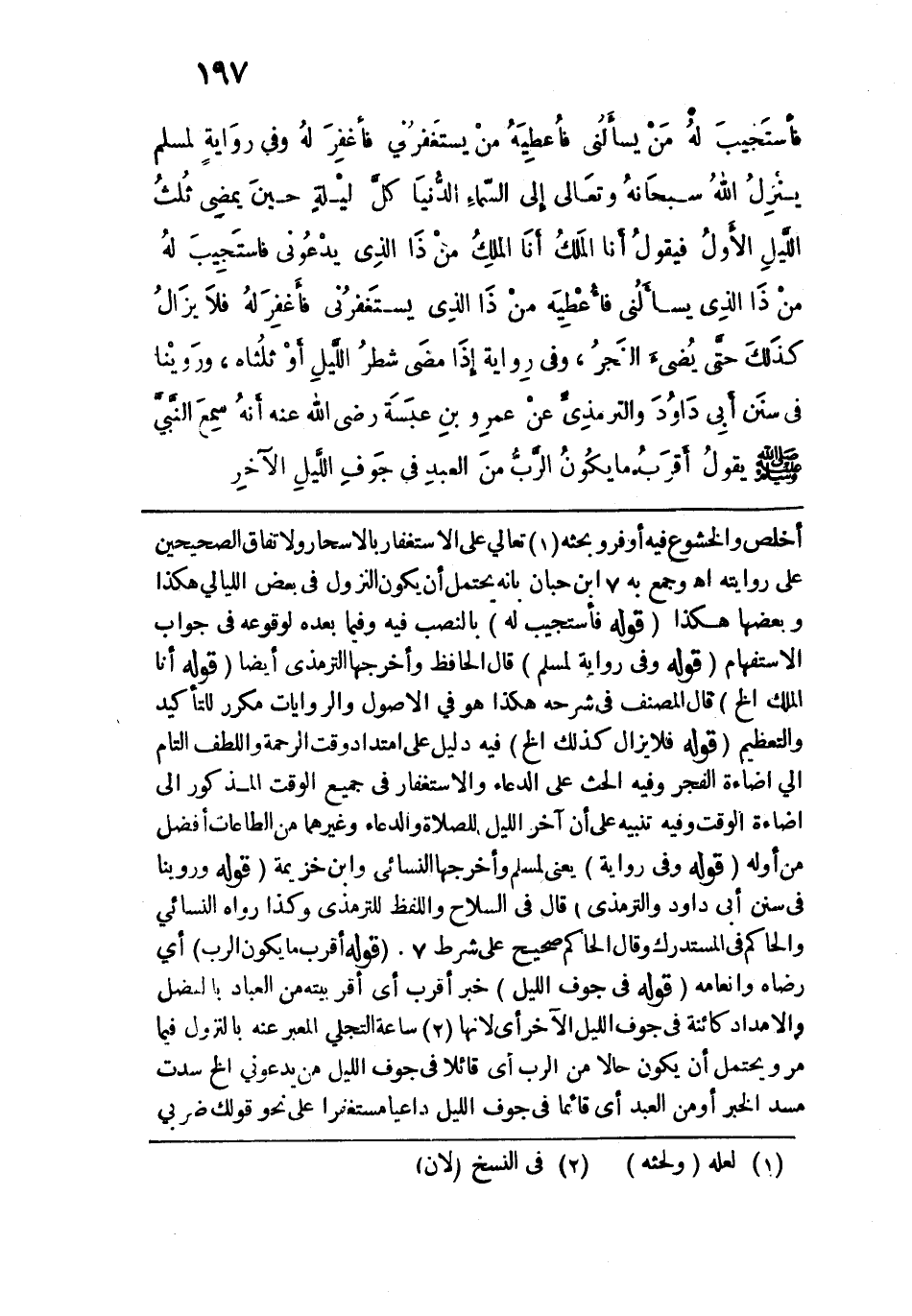 وفي رواية لمسلم: "يَنزِلُ اللهُ سُبْحانَهُ وتَعالى إلى السماءِ الدنْيا كُل لَيلَةٍ حِينَ يمضِي ثُلُثُ اللَّيلِ الأولُ فَيَقُولُ: أنا المَلِكُ أنا المَلِكُ، من ذا الذي يَدْعُوني فأسْتَجِيبَ لهُ، مَنْ ذَا الذي