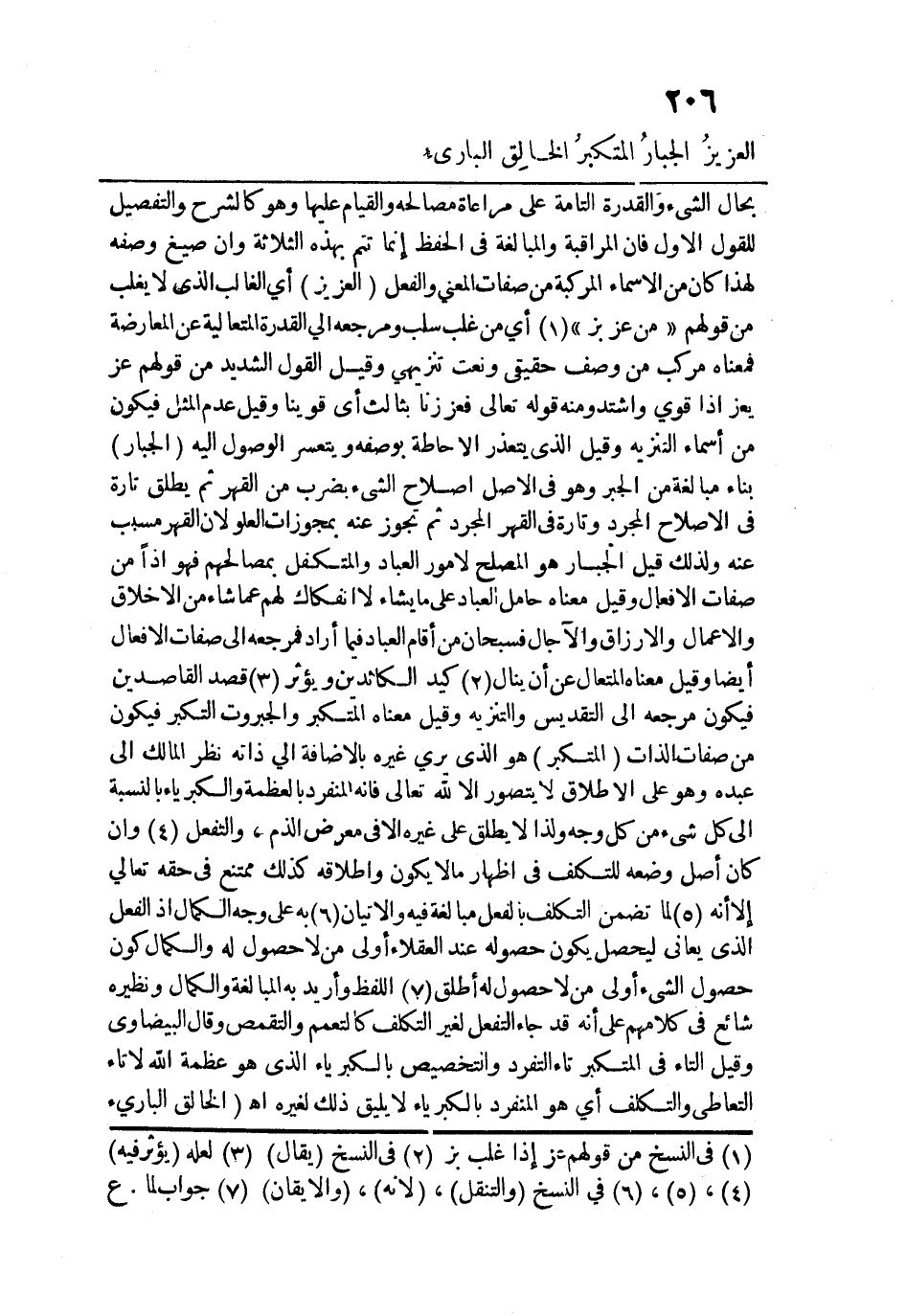 بحال الشيء والقدرة التامة على مراعاة مصالحه والقيام عليها وهو كالشرح والتفصيل للقول الأول فإن المراقبة والمبالغة في الحفظ إنما تتم بهذه الثلاثة وإن صيغ وصفه لهذا كان من الأسماء المركبة من صفات المعنى والفعل (العزيزُ) أي الغالب الذي لا يغلب من قولهم "من عزبز" أي من غلب سلب ومرجعه إلى القدرة المتعالية عن المعارضة فمعناه مركب من وصف حقيقي ونعت تنزيهي وقيل القول الشديد من قولهم عز يعز إذا قوي واشتد ومنه قوله تعالى: {فَعَزَّزنَا بِثَالثٍ} [يس 14] أي أي قوينا وقيل عدم المثل فيكون من أسماء التنزيه وقيل الذي يتعذر الإحاطة بوصفه ويتعسر الوصول إليه (الجبارُ) بناء مبالغة من الجبر وهو في الأصل إصلاح الشيء بضرب من القهر ثم يطلق تارة في الإصلاح المجرد وتارة في القهر المجرد ثم تجوز عنه بمجوزات العلو لأن القهر مسبب عنه ولذلك قيل الجبار هو المصلح لأمور العباد والمتكفل بمصالحهم فهو إذًا من صفات الأفعال وقيل معناه حامل العباد على ما يشاء لا انفكاك لهم عما شاء من الأخلاق والأعمال والأرزاق والآجال فسبحان من أقام العباد فيما أراد فمرجعه إلى صفات الأفعال أيضًا وقيل معناه المتعال عن أن يناله كيد الكائدين ويؤثر قصد القاصدين فيكون مرجعه إلى التقديس والتنزيه وقيل معناه المتكبر والجبروت التكبر فيكون من صفات الذات (المتكبرُ) هو الذي يرى غيره بالإضافة إلى ذاته نظر المالك إلى عبده وهو على الإطلاق لا يتصور إلَّا لله تعالى فإنه المنفرد بالعظمة والكبرياء بالنسبة إلى كل شيء من كل وجه ولذا لا يطلق على غيره إلَّا في معرض الذم، والتفعل وإن كان أصل وضعه للتكلف في إظهار ما لا يكون وإطلاقه كذلك ممتنع في حقه تعالى إلَّا أنه لما تضمن التكلف بالفعل مبالغة فيه والإتيان به على وجه الكمال إذ الفعل الذي يعاني ليحصل يكون حصوله عند العقلاء أولى من لا حصول له والكمال كون حصول الشيء أولى من لا حصول له أطلق اللفظ وأريد به المبالغة والكمال ونظيره شائع في كلامهم على أنه قد جاء التفعل لغير التكلف كالتعمم والتقمص وقال البيضاوي وقيل التاء في المتكبر تاء التفرد والتخصيص بالكبرياء الذي هو عظمة الله لا تاء التعاطي والتكلف أي هو المنفرد بالكبرياء لا يليق ذلك لغيره اهـ. قوله: (الخالق