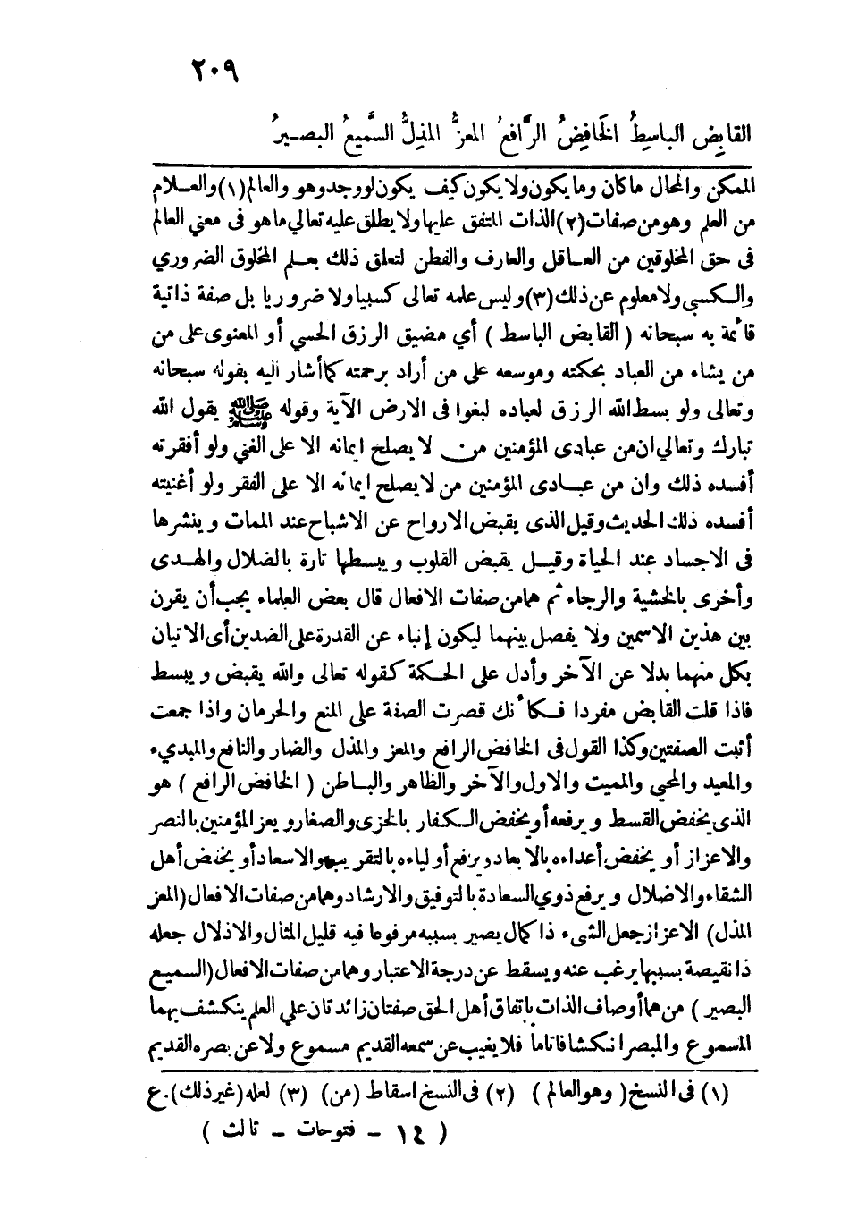 الممكن والمحال ما كان وما يكون ولا يكون كيف يكون لو وجد وهو والعالم والعلام من العلم وهو من صفات الذات المتفق عليها ولا يطلق عليه تعالى ما هو في معنى العالم في حق المخلوقين من العاقل والعارف والفطن لتعلق ذلك بعلم المخلوق الضروري والكسبي ولا معلوم عن ذلك وليس علمه تعالى كسبيًّا ولا ضروريًّا بل صفة ذاتية قائمة به سبحانه (القابض الباسِطُ) أي مضيق الرزق الحسين أو المعنوي على من يشاء من العباد بحكمته وموسعه عَلى من أراد برحمته كما أشار إليه بقوله سبحانه وتعالى: {وَلَوْ بَسَطَ اللَّهُ الرِّزْقَ لِعِبَادِهِ لَبَغَوْا فِي الْأَرْضِ} [الشورى: 27] الآية وقوله - صلى الله عليه وسلم - يقول الله تبارك وتعالى أن من عبادي المؤمنين من لا يصلح إيمانه إلَّا على الغنى ولو أفقرته أفسده ذلك وإن من عبادي المؤمنين من لا يصلح إيمانه إلَّا على الفقر ولو أغنيته أفسده ذلك الحديث وقيل الذي يقبض الأرواح عن الأشباح عند الممات وينشرها في الأجساد عند الحياة وقيل يقبض القلوب ويبسطها تارة بالضلال والهدى وأخرى بالخشية والرجاء ثم هما من صفات الأفعال قال بعض العلماء يجب أن يقرن بين هذين الاسمين ولا يفصل بينهما ليكون إنباء عن القدرة على الضدين أي الاتيان بكل منهما بدلا عن الآخر وأدل على الحكمة كقوله تعالى: {وَاللَّهُ يَقْبِضُ وَيَبْسُطُ} [البقرة: 245] فإذا قلت القابض مفردًا فكأنك قصرت الصفة على المنع والحرمان وإذا جمعت أثبت الصفتين وكذا القول في الخافض الرافع والمعز والمذل والضار والنافع والمبدئ والمعيد والمحيي والمميت والأول والآخر والظاهر والباطن (الخَافِضُ الرَافعُ) هو الذي يخفض القسي ويرفعه أو يخفض الكفار بالخزي والصغار ويعز المؤمنين بالنصر والإعزاز أو يخفض أعداءه بالإبعاد ويرفع أولياءه بالتقريب والإسعاد أو يخفض أهل الشقاء والإضلال ويرفع ذوي السعادة بالتوفيق والإرشاد وهما من صفات الأفعال (المعزُّ المذِل) الإعزاز جعل الشيء ذا كمال يصير بسببه مرفوعًا فيه قليل المثال والإذلال جعله ذا نقيصة بسببها يرغب عنه ويسقط عن درجة الاعتبار وهما من صفات الأفعال (السميعُ البصيرُ) من هما أوصاف الذات باتفاق أهل الحق صفتان زائدتان على العلم ينكشف بهما المسموع والمبصر انكشافًا تامًّا فلا