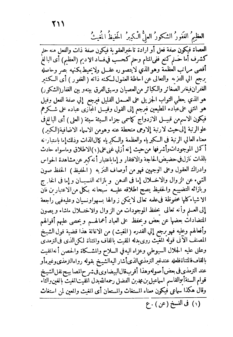 العصاة فيكون صفة فعل أو إرادة تأخير العقوبة فيكون صفة ذات والفعل منه حلم كشرف أما حلم كمنع ففي المنام وحلم كحسب في فساد الأديم (العظيمُ) أي البالغ أقصى مراتب العظمة وهو الذي لا يتصوره عقل ولا يحيط بكنهه بصر وحاصله يرجع إلى التنزيه والتعالي عن إحاطة العقول لكنه ذاته (الغَفورُ) أي الكثير الغفران فيغفر الصغائر والكبائر من العصيان وسبق الفرق بينه وبين الغفار (الشكورُ) هو الذي يعطي الثواب الجزيل على العمل القليل فيرجع إلى صفة الفعل وقيل هو المثني على عباده المطيعين فيرجع إلى القول وقيل المجازي عباده على شرهم فيكون الاسم من قبيل الازدواج كما سمي جزاء السيئة سيئة (العلِي) أي البالغ في علو التربة إلى حيث لا رتبة إلّا وهي منحطة عنه وهو من الأسماء الإضافية (الْكبيرُ) معناه العالي الرتبة في الكبرياء والعظمة والكبرياء كمال الذات وذلك إما باعتبار أنه أكمل الموجودات وأشرفها من حيث أنه أزلي غني على الإطلاق وما سواه حادث بالذات نازل في حضيض الحاجة والافتقار وإما باعتبار أنه كبير عن مشاهدة الحواس وإدراك العقول وعلى الوجهين فهو من أوصاف التنزيه (الحَفيظ) الحفظ صون الشيء عن الزوال والإخلال إما في الذهن وبإزائه النسيان وإما