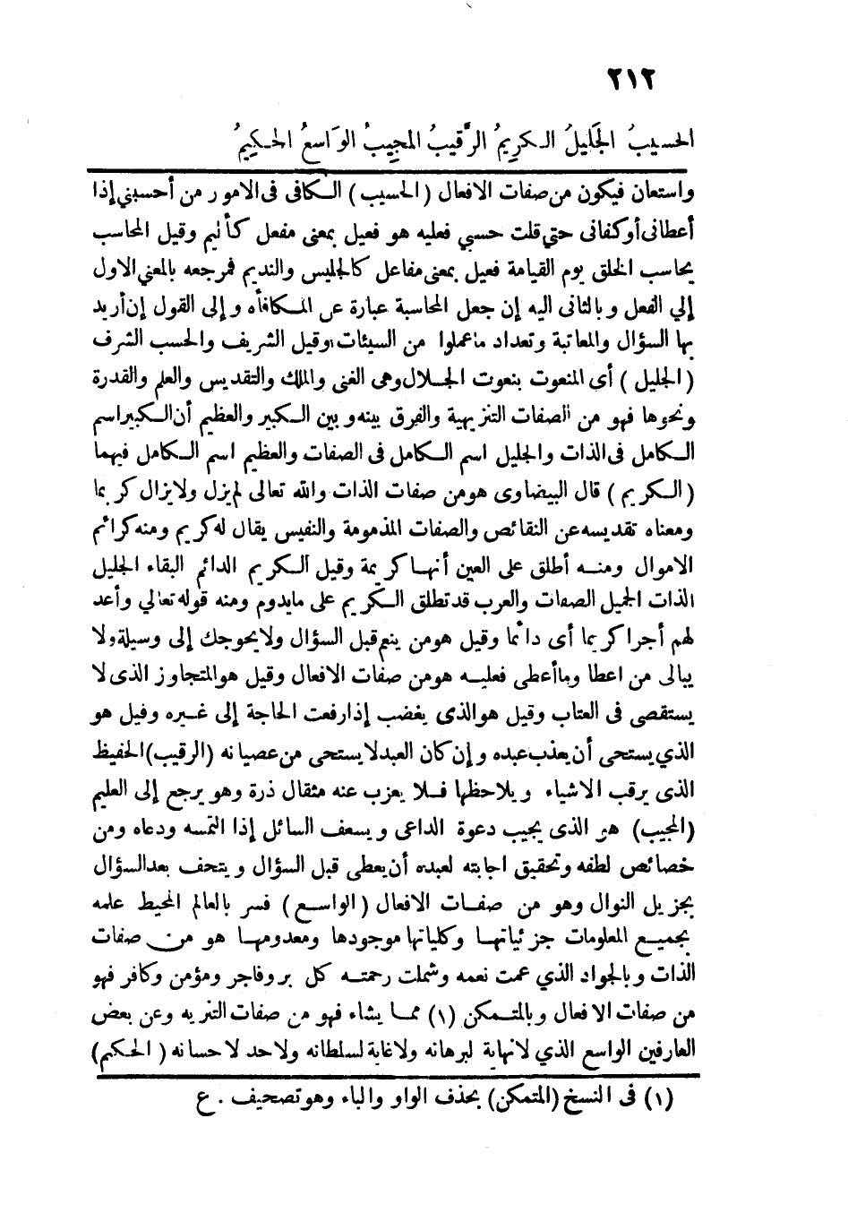 واستعان فيكون من صفات الأفعال (الحسيبُ) الكافي في الأمور من أحسبني إذا أعطاني أو كفاني حتى قلت حسبي فعليه هو فعيل بمعنى مفعل كأليم وقيل المحاسب يحاسب الخلق يوم القيامة فعيل بمعنى مفاعل كالجليس والنديم فمرجعه بالمعنى الأول إلى الفعل وبالثاني إليه إن جعل المحاسبة عبارة عن المكافأة إلى القول إن أريد بها السؤال والمعاتبة وتعداد ما عملوا من السيئات وقيل الشريف والحسب الشرف (الجَليل) أي المنعوت بنعوت الجلال وهي الغنى والملك والتقديس والعلم والقدرة ونحوها فهو من الصفات التنزيهية والفرق بينه وبين الكبير والعظيم أن الكبير اسم الكامل في الذات والجليل اسم الكامل في الصفات والعظيم اسم الكامل فيهما (الكرِيمُ) قال البيضاوي هو من صفات الذات والله تعالى لم يزل ولا يزال كريمًا ومعناه تقديسه عن النقائص والصفات المذمومة والنفيس يقال له كريم ومنه كرائم الأموال ومنه أطلق على العين أنها كريمة وقيل الكريم الدائم البقاء الجليل الذات الجميل الصفات والعرب قد تطلق الكريم على ما يدوم ومنه قوله تعالى وأعد لهم أجرًا كريمًا أي دائمًا وقيل هو من ينعم قبل السؤال ولا يحوجك إلى وسيلة ولا يبالي من أعطا وما أعطى فعليه هو من صفات الأفعال وقيل هو المتجاوز الذي لا يستقصي في العتاب وقيل هو الذي يغضب إذا رفعت الحاجة إبى غيره قيل هو الذي يستحي أن يعذب عبده وإن كان العبد لا يستحي من عصيانه (الرقيب) الحفيظ الذي يرقب الأشياء ويلاحظها فلا يعزب عنه مثقال ذرة وهو يرجع إلى العليم (المجِيبُ) هو الذي يجيب دعوة الداعي ويسعف السائل إذا التمسه ودعاه ومن خصائص لطفه وتحقيق إجابته لعبده أن يعطي قبل السؤال ويتحف بعد السؤال بجزيل النوال وهو من صفات الأفعال (الوَاسعُ) فسر بالعالم المحيط علمه بجميع المعلومات جزئياتها وكلياتها وموجودها ومعدومها هو من صفات الذات وبالجواد الذي عمت نعمه وشملت رحمته كل بر وفاجر ومؤمن وكافر فهو من صفات الأفعال وبالمتمكن مما يشاء فهو من صفات التنزيه وعن بعض العارفين الواسع الذي لا نهاية لبرهانه ولا غاية لسلطانه ولا حد لإحسانه (الحكِيمُ)