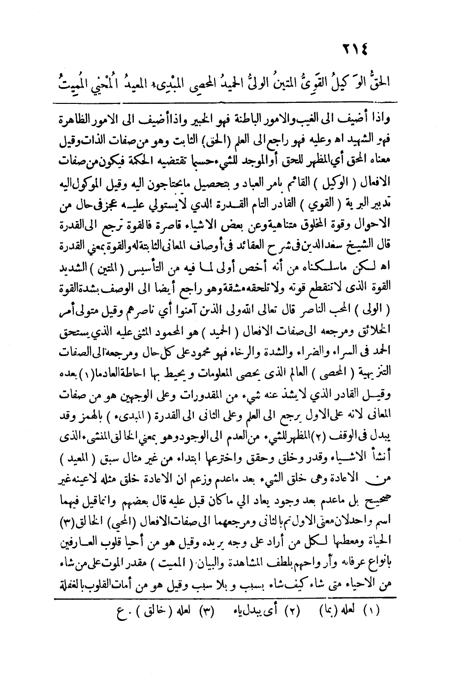 الصفات التنزيهية (المحصِي) العالم الذي يحصي المعلومات ويحيط بها إحاطة العادما يعده وقيل القادر الذي لا يشذ عنه شيء من المقدورات وعلى الوجهين هو من صفات المعاني لأنه على الأول يرجع إلى العلم وعلى الثاني إلى القدرة (المبْدِىُ) بالهمز وقد يبدل في الوقف المظهر للشيء من العدم إلى الوجود وهو بمعنى الخالق المنشئ الذي أنشأ الأشياء وقدر وخلق وحقق واخترعها ابتداء من غير مثال سبق (المعيدُ) من الإعادة وهي خلق الشيء بعد ما عدم وزعم أن الإعادة خلق مثله لا عينه غير صحيح بل ما عدم بعد وجود يعاد إلى ما كان قبل عليه قال بعضهم وإنما قيل فيهما اسم واحد لأن معنى الأول تم بالثاني ومرجعهما إلى صفات الأفعال (المُحْيِي) الخالق الحياة ومعطها لكل من أراد على وجه يريده وقيل هو من أحيا قلوب العارفين بأنواع عرفانه وأرواحهم بلطف المشاهدة والبيان (المُمِيتُ) مقدر الموت على من شاء من الإحياء متى شاء كيف شاء بسبب وبلا سبب وقيل هو من أمات القلوب بالغفلة