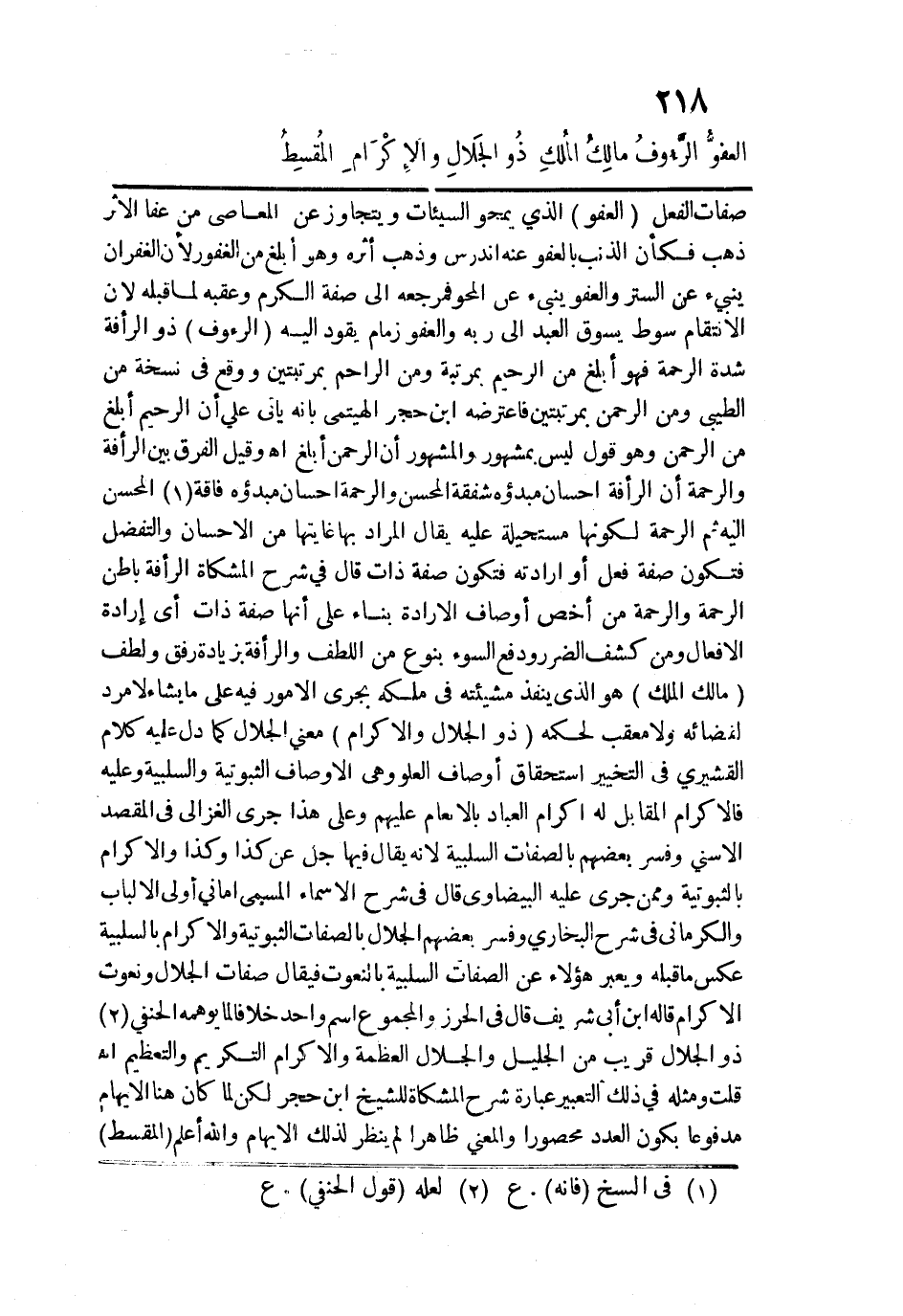 صفات الفعل (العفوُّ) الذي يمحو السيئات ويتجاوز عن المعاصي من عفا الأثر ذهب فكأن الذنب بالعفو عنه اندرس وذهب أثره وهو أبلغ من الغفور لأن الغفران ينبيء عن الستر والعفو ينبيء عن المحو فمرجعه إلى صفة الكرم وعقبه لما قبله لأن الإنتقام سوط يسوق العبد إلى ربه والعفو زمام يقود إليه (الرَّؤُوف) ذو الرأفة شدة الرحمة فهو أبلغ من الرحيم بمرتبة ومن الراحم بمرتبتين ووقع في نسخة من الطيبي ومن الرحمن بمرتبتين فاعترضه ابن حجر الهيتمي بأنه يأتي على أن الرحيم أبلغ من الرحمن وهو قول ليس بمشهور والمشهور أن الرحمن أبلغ اهـ، وقيل الفرق بين الرأفة والرحمة أن الرأفة إحسان مبدأه شفقة المحسن والرحمة إحسان مبدأه فاقة المحسن إليه ثم الرحمة لكونها مستحيلة عليه يقال المراد بها غايتها من الإحسان والتفضل فتكون صفة فعل أو إرادته فتكون صفة ذات قال في شرح المشكاة الرأفة باطن الرحمة والرحمة من أخص أوصاف الإرادة بناء على أنها صفة ذات أي إرادة الأفعال ومن كشف الضرر ودفع السوء بنوع من اللطف والرأفة بزيادة رفق ولطف (مالِكُ المُلكِ) هو الذي ينفذ مشيئته في ملكه يجري الأمور فيه على ما يشاء لا مرد لقضائه ولا معقب لحكمه (ذُو الجلال والإِكْرَامِ) معنى الجلال كما دل عليه كلام القشيري في التخيير استحقاق أوصاف العلو وهي الأوصاف الثبوتية والسلبية وعليه فالإكرام المقابل له إكرام العباد بالإنعام عليهم وعلى هذا جرى الغزالي في المقصد الأسني وفسر بعضهم بالصفات السلبية لأنه يقال فيها جل عن كذا وكذا والإكرام بالثبوتية وممن جرى عليه البيضاوي قال في شرح الأسماء المسمى أماني أولي الألباب والكرماني في شرح البخاري وفسر بعضهم الجلال بالصفات الثبوتية والإكرام بالسلبية عكس ما قبله ويعبر هؤلاء عن الصفات السلبية بالنعوت فيقال صفات الجلال ونعوت الإكرام قاله ابن أبي شريف قال في الحرز والمجموع اسم واحد خلافًا لما يوهمه الحنفي ذو الجلال قريب من الجليل والجلال العظمة والإكرام التكريم والتعظيم اهـ قلت ومثله في ذلك التعبير عبارة شرح المشكاة للشيخ ابن حجر لكن لما كان هنا الإيهام مدفوعا يكون العدد محصورا والمعنى ظاهرًا لم ينظر لذلك الإيهام والله أعلم. (المُقسِطُ)