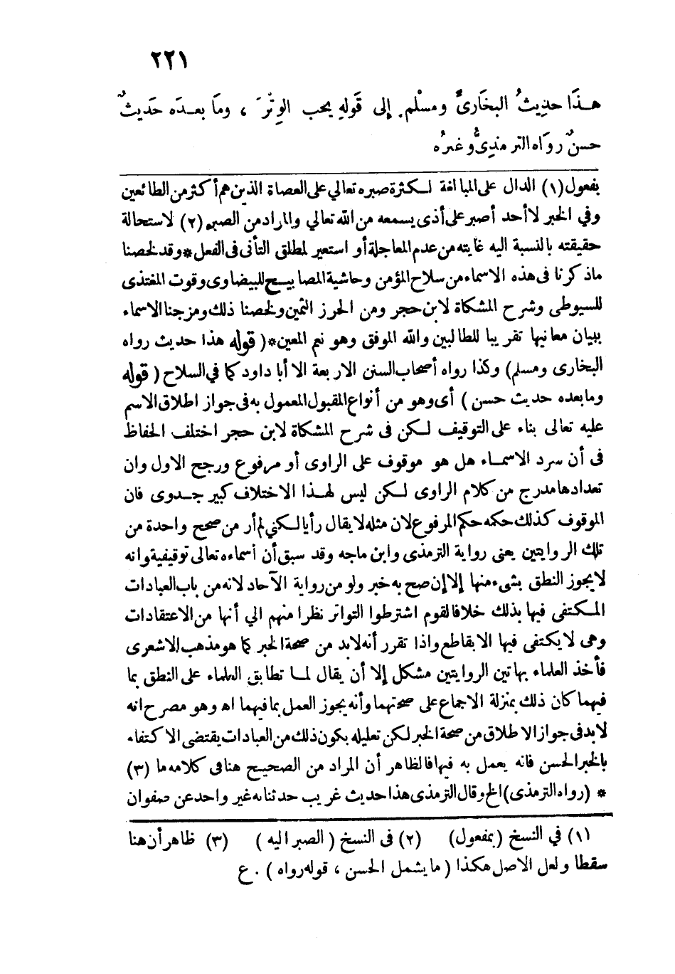 قوله: (هذَا حدِيث رَوَاه البُخَاري ومسلم) وكذا رواه أصحاب السنن الأربعة إلَّا أبا داود كما في السلاح. قوله: (ومَا بعدَه حديثٌ حسن) أي وهو من أنواع المقبول المعمول به في جواز إطلاق الاسم عليه تعالى بناء على التوقيف لكن في شرح المشكاة لابن حجر اختلف الحفاظ في أن سرد الأسماء هل هو موقوف على الراوي أو مرفوع ورجح الأول وإن تعدادها مدرج من كلام الراوي لكن ليس لهذا الاختلاف كبير جدوى فإن الموقوف كذلك حكمه حكم المرفوع لأن مثله لا يقال رأيًا لكني لم أر من صحح واحدة من تلك الروايتين يعني رواية الترمذي وابن ماجة وقد سبق أن أسماءه تعالى توقيفية وأنه لا يجوز النطق بشيء منها إلَّا إن صح به خبر ولو من رواية الآحاد لأنه من باب العبادات المكتفي فيها بذلك خلافًا لقوم اشترطوا التواتر نظرًا منهم إلى أنها من الاعتقادات وهي لا يكتفي فيها إلّا بقاطع وإذا تقرر أنه لا بد من صحة الخبر كما هو مذهب الأشعري فأخذ العلماء بهاتين الروايتين مشكل إلّا أن يقال لما تطابق العلماء على النطق بما فيهما كان ذلك بمنزلة الإجماع على صحتهما وأنه يجوز العمل بما فيهما اهـ، وهو مصرح أنه لا بد في جواز الإطلاق من صحة الخبر لكن تعليله يكون ذلك من العبادات يقتضي الاكتفاء بالخبر الحسن فإنه يعمل به فيها فالظاهر أن المراد من الصحيح هنا في كلامه ما.