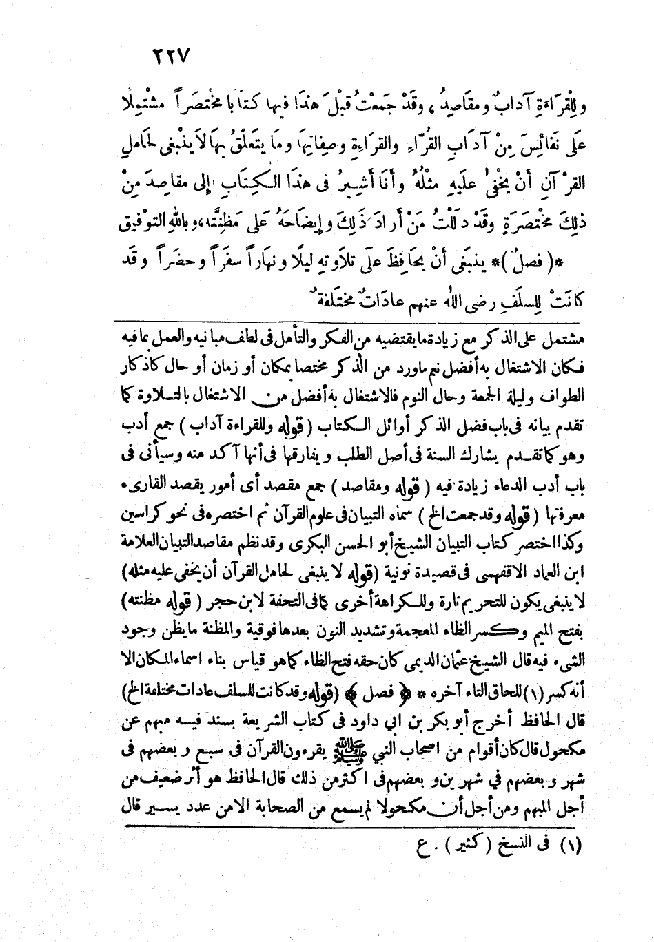 مشتمل على الذكر مع زيادة ما يقتضيه من الفكر والتأمل في لطف مبانيه والعمل بما فيه فكان الاشتغال به أفضل نعم ما ورد من الذكر مختصًا بمكان أو زمان أو حال كأذكار الطواف وليلة الجمعة وحال النوم فالاشتغال به أفضل من الاشتغال بالتلاوة كما تقدم بيانه في باب فضل الذكر أوائل الكتاب. قوله: (ولِلْقَرَاءَةِ آداب) جمع أدب وهو كما تقدم يشارك السنة في أصل الطلب ويفارقها في أنها آكد منه وسيأتي في باب أدب الدعاء زيادة فيه. قوله: (ومقَاصِدُ) جمع مقصد أي أمور يقصد القارئ معرفتها. قوله: (وقَدْ جَمعْتُ الخ) سماه التبيان في علوم القرآن ثم اختصره في نحو كراسين وكذا اختصر كتاب التبيان الشيخ أبو الحسن البكري وقد نظم مقاصد التبيان العلامة ابن العماد الأقفهسي في قصيدة نونية. قوله: (لَا ينْبغي لحَاملِ القرْآنِ أَنْ يخْفى علَيهِ مثْلُهُ) لا ينبغي يكون للتحريم تارة وللكراهة أخرى كما في التحفة لابن حجر. قوله: (مَظِنَّته) بفتح الميم وكسر الظاء المعجمة وتشديد النون بعدها فوقية والمظنة ما يظن وجود الشيء فيه قال الشيخ عثمان الديمي كان حقه فتح الظاء كما هو قياس بناء أسماء المكان إلَّا أنه كسر للحاق التاء آخره.