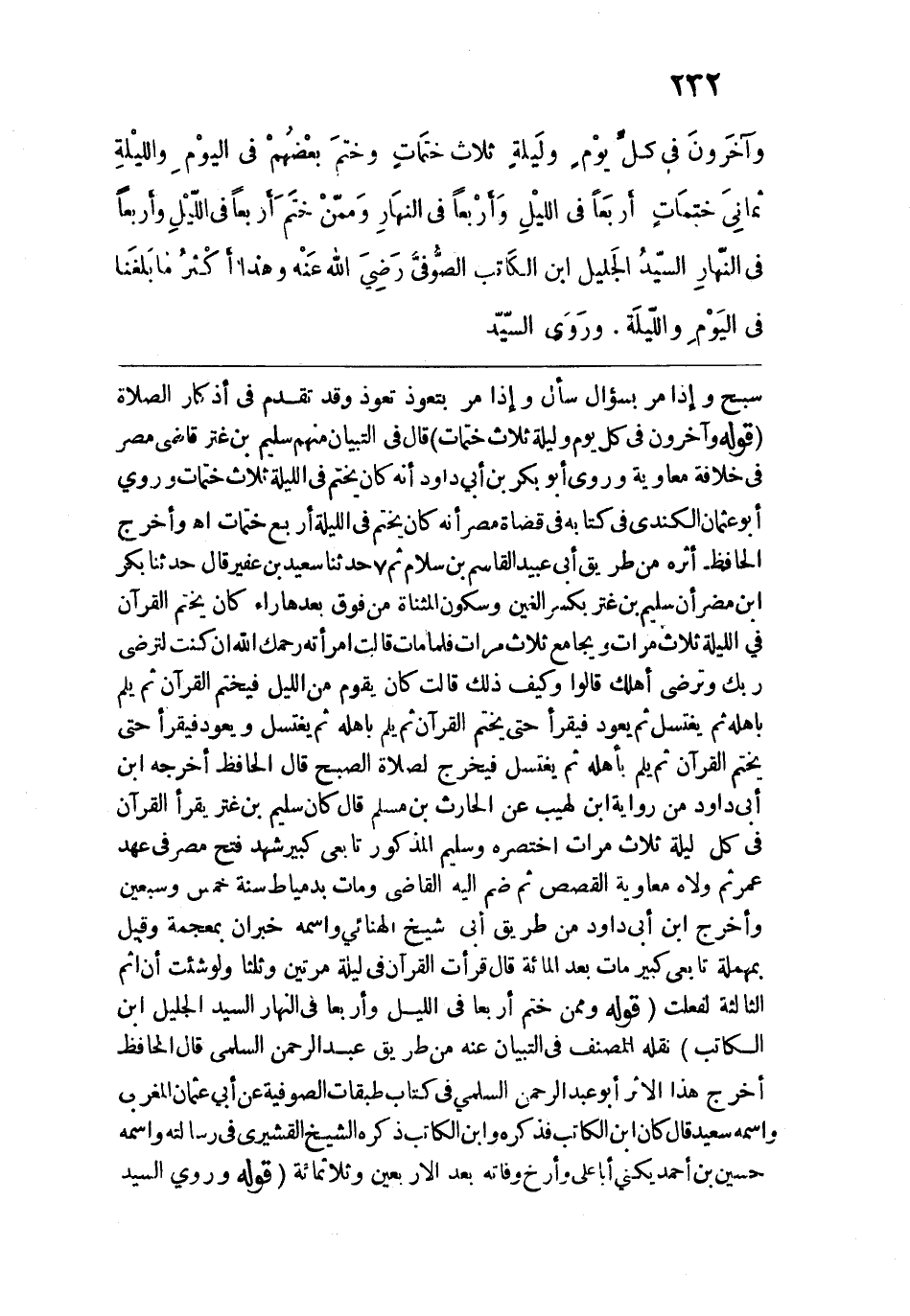 وترضي أهلك قالوا وكيف ذلك قالت كان يقوم من الليل فيختم القرآن ثم يلم بأهله ثم يغتسل ثم يعود فيقرأ حتى يختم القرآن ثم يلم بأهله يغتسل ويعود فيقرأ حتى يختم القرآن ثم يلم بأهله ثم يغتسل فيخرج لصلاة الصبح قال الحافظ أخرجه ابن أبي داود من رواية ابن لهيب عن الحارث بن مسلم قال كان سليم بن غتر يقرأ القرآن في كل ليلة ثلاث مرات اختصره وسليم المذكور تابعي كبير شهد فتح مصر في عهد عمر ثم ولاه معاوية القصص ثم ضم إليه القاضي ومات بدمياط سنة خمس وسبعين وأخرج ابن أبي داود من طريق أبي شيخ الهنائي واسمه خبران بمعجمة وقيل بمهملة تابعي كبير مات بعد المائة قال قرأت القرآن في ليلة مرتين وثلثًا ولو شئت أن أتم الثالثة لفعلت. قوله: (وَممّنْ ختَمَ أَربعًا في اللّيْلِ وأَربعًا في النهارِ السيدُ الجَليل ابنْ الكاتب) نقله المصنف في التبيان عنه من طريق عبد الرحمن السلمي قال الحافظ أخرج هذا الأثر أبو عبد الرحمن السلمي في كتاب طبقات الصوفية عن أبي عثمان المغربي واسمه سعيد قال كان ابن الكاتب فذكره وابن الكاتب ذكره الشيخ القشيري في رسالته واسمه حسين بن أحمد يكنى أبا علي وأرخ وفاته بعد الأربعين وثلاثمائة. قوله: (وَرَوى السّيدُ