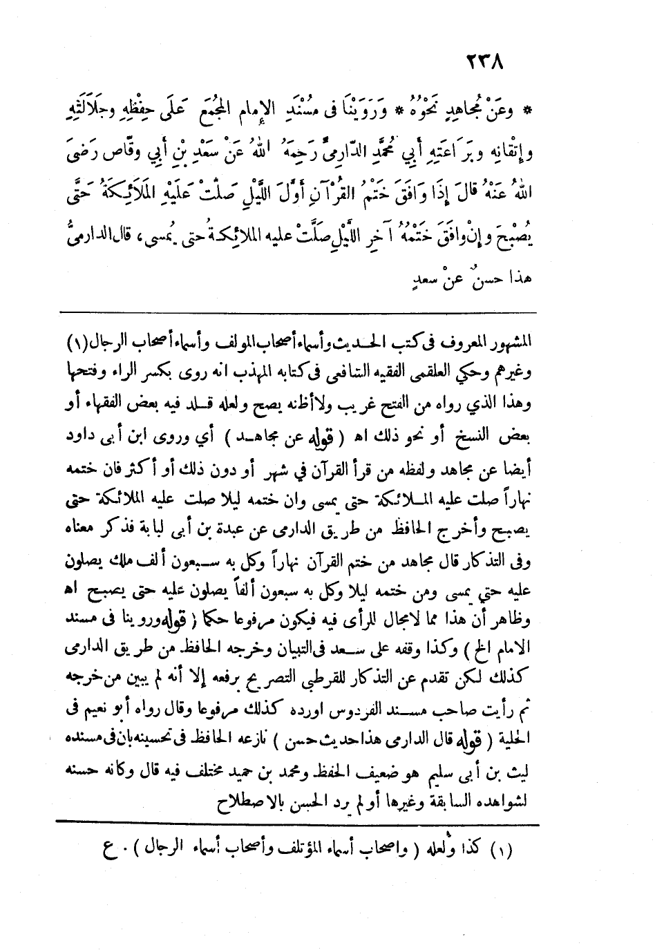 ختمه ليلًا وكل به سبعون ألفًا يصلون عليه حتى يصبح اهـ، وظاهر أن هذا مما لا مجال للرأي فيه فيكون مرفوعًا حكمًا. قوله: (وَرَوَينَا في مُسْنَدِ الإِمام الخ) وكذا وقفه على سعد في التبيان وخرجه الحافظ من طريق الدارمي كذلك لكن تقدم عن التذكار للقرطبي التصريح برفعه إلَّا أنه لم يبين من خرجه ثم رأيت صاحب مسند الفردوس أورده كذلك مرفوعًا وقال رواه أبو نعيم في الحلية. قوله: (قَال الدارمي هذا حديث حسن) نازعه الحافظ في تحسينه بأن في مسنده ليث بن أبي سليم هو ضعيف الحفظ ومحمد بن حميد مختلف فيه قال وكأنه حسنه لشواهده السابقة وغيرها أو لم يرد الحسن بالاصطلاح.