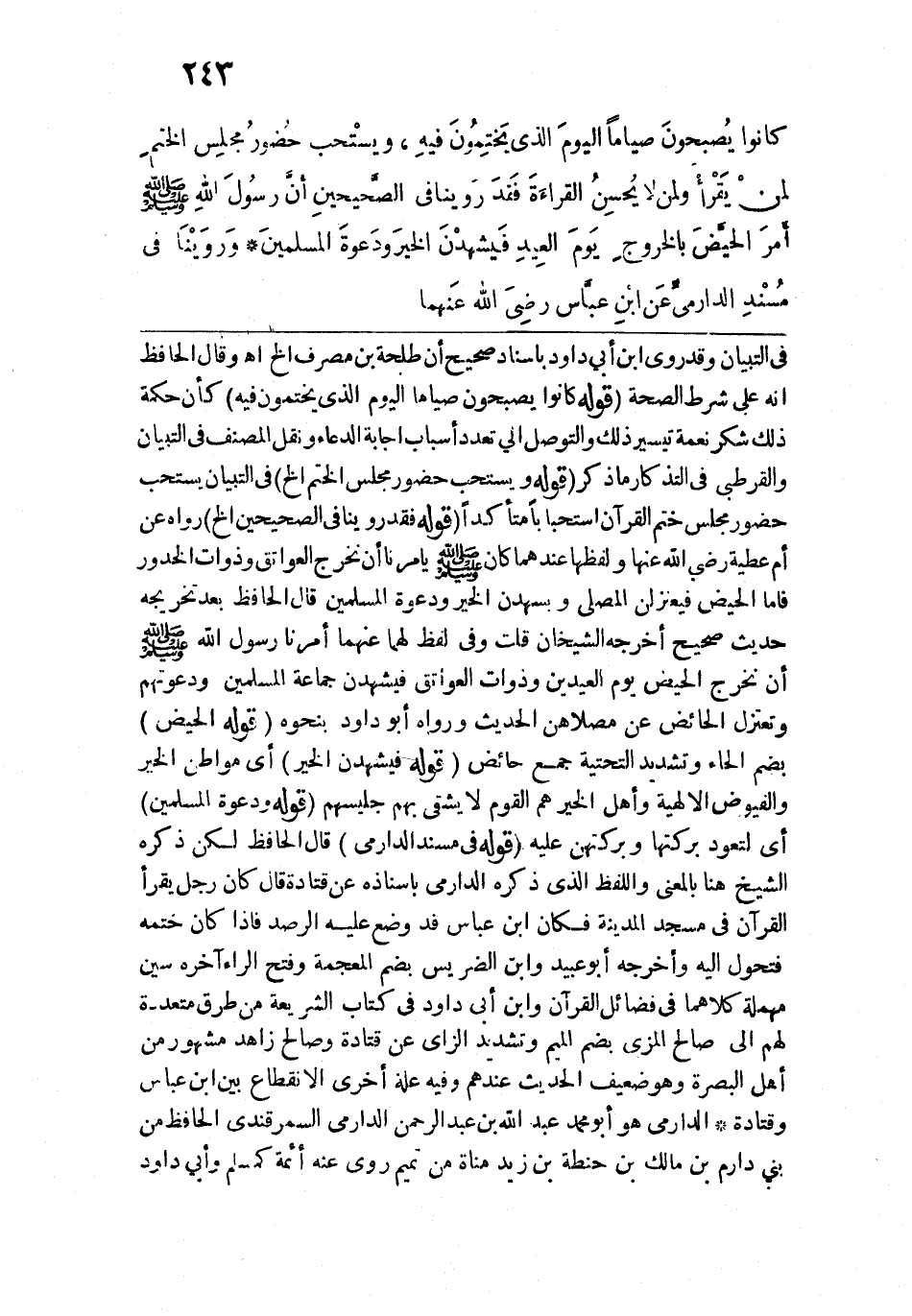 في التبيان وقد روى ابن ابن أبي داود بإسناد صحيح أن طلحة بن مصرف الخ اهـ، وقال الحافظ أنه على شرط الصحة. قوله: (كانوا يُصبحونَ صيامًا اليومَ الذي يَختمونَ فيهِ) كأن حكمة ذلك شكر نعمة تيسير ذلك والتوصل إلى تعدد أسباب إجابة الدعاء ونقل المصنف في التبيان والقرطبي في التذكار ما ذكر قوله: (يسْتحب حُضورُ مجلس الختم الخ) في التبيان يستحب حضور مجلس ختم القرآن استحبابا متأكدًا. قوله: (فقدَ رَوَينَا في الصحيحين) رواه عن أم عطية رضي الله عنها ولفظها عندهما كان - صلى الله عليه وسلم - يأمرنا أن نخرج العواتق وذوات الخَدور فأما الحيض فيعتزلن المصلى ويشهدن الخير ودعوة المسلمين قال الحافظ بعد تخريجه حديث صحيح أخرجه الشيخان قلت وفي لفظ لهما عنهما أمرنا رسول الله - صلى الله عليه وسلم - أن نخرج الحيض يوم العيدين وذوات العواتق فيشهدن جماعة المسلمين ودعوتهم وتعتزل الحائض عن مصلاهن الحديث ورواه أبو داود بنحوه. قوله: (الحيض بضم الحاء وتشديد التحتية جمع حائض قوله.: (فيشهدن الخيرَ) أي مواطن الخير والفيوض الإلهية وأهل الخير هم القوم لا يشقى بهم جليسهم. قوله: (ودَعوةَ المسلمينَ) أي لتعود بركتها وبركتهن عليه. قوله: (مُسْندِ الدارمي) قال الحافظ لكن ذكره الشيخ هنا بالمعنى واللفظ الذي ذكره الدارمي بإسناده عن قتادة قال كان رجل يقرأ القرآن في مسجد المدينة فكان ابن عباس قد وضع عليه الرصد فإذا كان ختمه فتحول إليه وأخرجه أبو عبيد وابن الضريس بضم المعجمة وفتح الراء آخره سين مهملة كلاهما في فضائل القرآن وابن أبي داود في كتاب الشريعة من طرق متعددة لهم إلى صالح المزي بضم الميم وتشديد الزاي عن قتادة وصالح زاهد مشهور من أهل البصرة وهو ضعيف الحديث عندهم وفيه علة أخرى الانقطاع بين ابن عباس وقتادة.