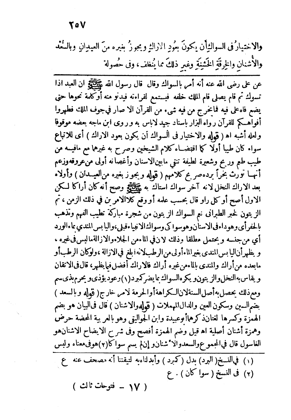 أشبه اهـ. قوله: (والاختيارُ في السواكِ أَن يكونَ بعُودِ الاراكِ) أي للاتباع سواء كان طيبًا أو لا كما اقتضاه كلام الشيخين وصرح به غيرهما مع ما فيه من طيب طعم وريح وشعيرة لطيفة تنقي ما بين الأسنان وأغصانه أولى من عروقه وزعم أنها تورث بخرًا يرده صريح كلامهم. قوله: (ويجوزُ منَ العيِدانِ) وأولاه بعد الأراك النخل لأنه آخر سواك استاك به - صلى الله عليه وسلم - وصح أنه كان أراكا لكن الأول أصح أو كل راوٍ قال بحسب علمه أو وقع كلا الأمرين في ذلك الزمن، ثم الزيتون لخبر الطبراني نعم السواك الزيتون من شجرة مباركة تطيب الفهم وتذهب بالحفر أي وهو داء في الأسنان وهو سواكي وسواك الأنبياء قبلي، واليابس المندى بماء الورد أي من جنسه ويحتمل مطلقًا وذلك لأن في الماء من الجلاء والإزالة ما ليس في غيره، ويظهر أن اليابس المندى بغير الماء أولى من الرطب لأنه أبلغ في الإزالة، ولو كان الرطب أو ما بعده من أراك والمندى بالماء من غيره أراك فالأراك أفضل فيما يظهر، قال في الإتقان ويقاس به النخل والزيتون ويكره السواك بما يضر كمبرد وعود يؤذي ويحرم بذي سم ومع ذلك يحصل به أصل السنة لأن الكراهة أو الحرمة لأمر خارج. قوله: (وبالسعد) بضم السين وسكون العين والدال المهملات. قوله: (والأُشنانِ) قال في البيان هو بضم الهمزة وكسرها لغتان ذكرهما أبو عبيدة وابن الجواليقي وهو بالعربية المحضة حرض وهمزة اشنان أصلية اهـ. قيل وضم الهمزة أفصح وفي شرح الإيضاح الأشنان هو الغاسول قال في المجموع والسعد والأشنان وإن لم يسم سواكًا هو في معناه وليس