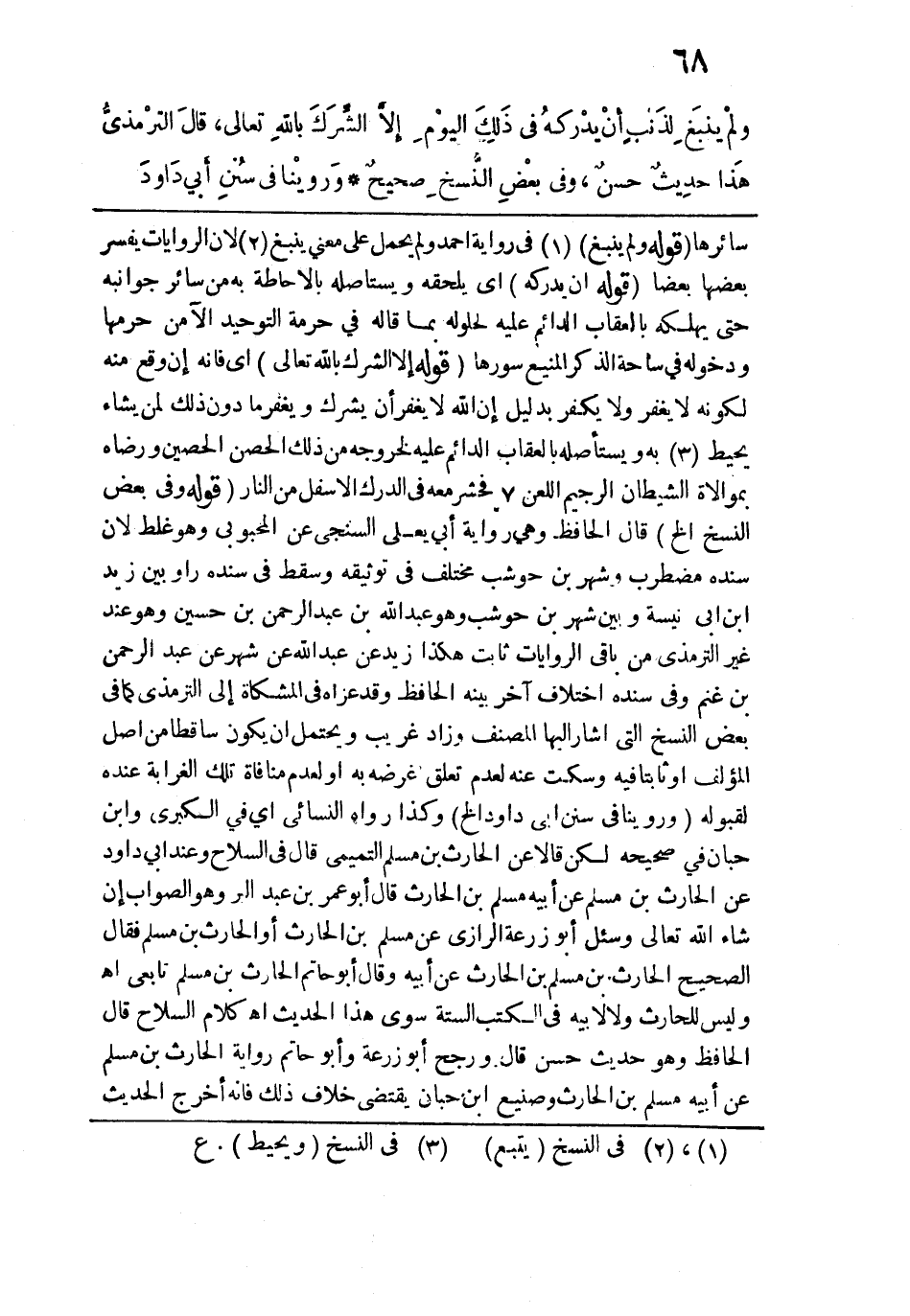 ويغفر ما دون ذلك لمن يشاء يحيط به ويستأصله بالعقاب الدائم عليه لخروجه من ذلك الحصين الحصين ورضاه بموالاة الشيطان الرجيم اللعن فحشر معه في الدرك الأسفل من النار. قوله: (وفي بعْضِ النسخِ الخ) قال الحافظ وهي رواية أبي يعلى السنجي عن المحبوبي وهو غلط لأن سنده مضطرب وشهر بن حوشب مختلف في توثيقه وسقط في سنده راو بين زيد بن أبي أنيسة وبين شهر بن حوشب وهو عبد الله بن عبد الرحمن بن حسين وهو عند غير الترمذي من باقي الروايات ثابت هكذا زيد عن عبد الله عن شهر عن عبد الرحمن بن غنم وفي سنده اختلاف آخر بينه الحافظ وقد عزاه في المشكاة إلى الترمذي كما في بعض النسخ التي أشار إليها المصنف وزاد غريب ويحتمل أن يكون ساقطًا من أصل المؤلف أو ثابتًا فيه وسكت عنه لعدم تعلق غرضه به أو لعدم منافاة تلك الغرابة عنده لقبوله.